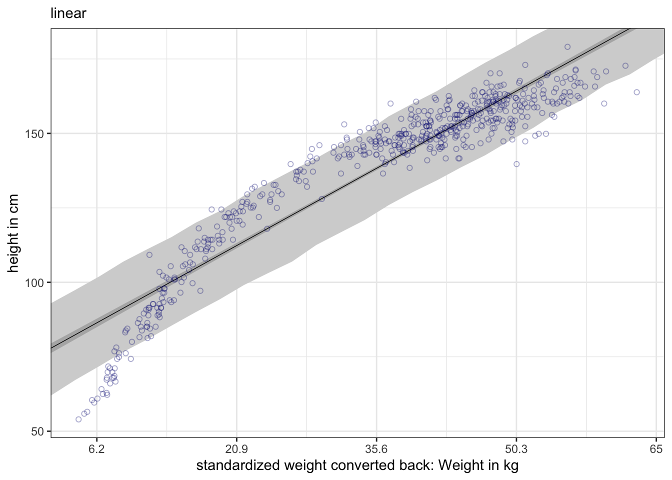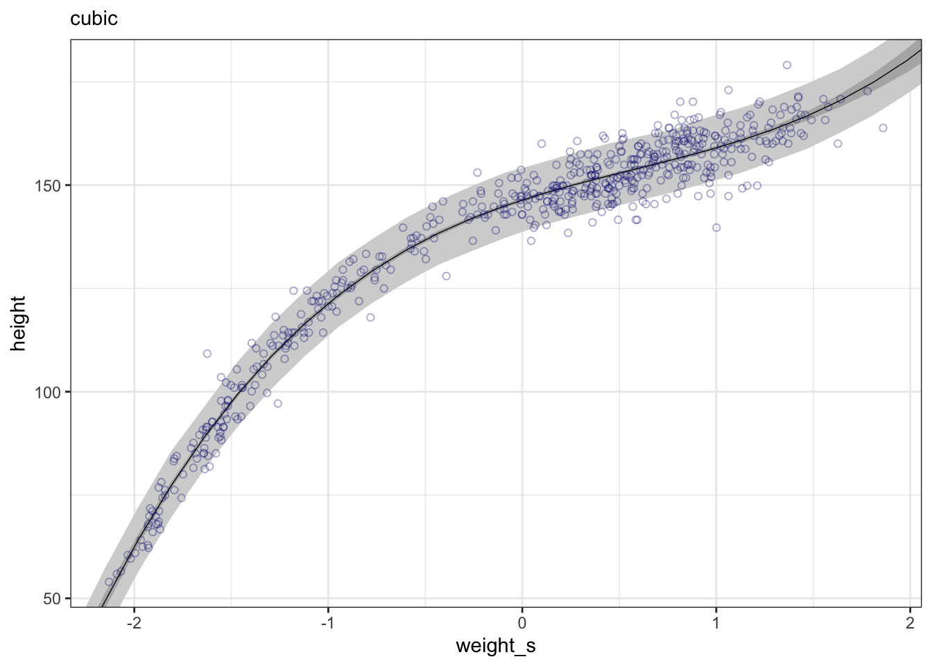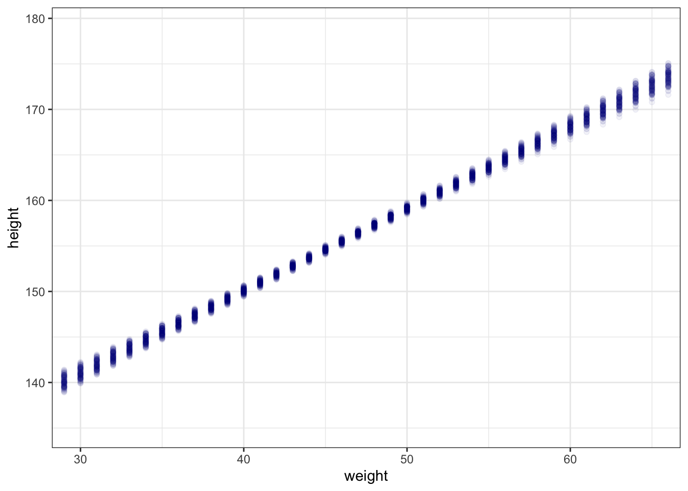 In contrast to the vcov() values of the centered weight version in Example 4.20 we have now big covariances. But the posterior predictions of both models (centered and uncentered version) are nearly the same. Compare with Graph 4.30 (Original) and Graph 4.32 (Tidyverse).