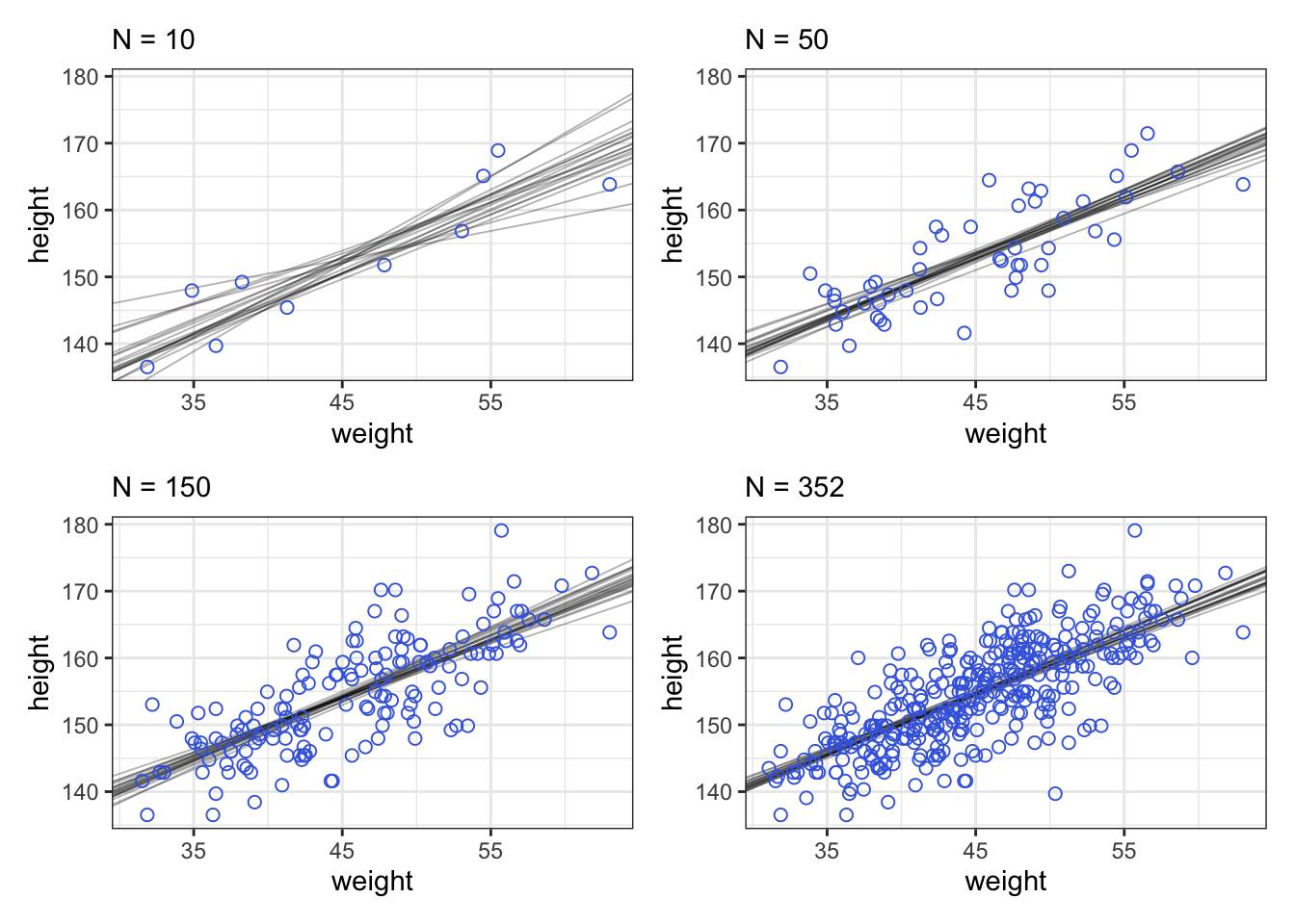 “This chapter introduces linear regression as a Bayesian procedure. Under a probability interpretation, which is necessary for Bayesian work, linear regression uses a Gaussian (normal) distribution to describe our golem’s uncertainty about some measurement of interest.” (McElreath, 2020, p. 71) (pdf)