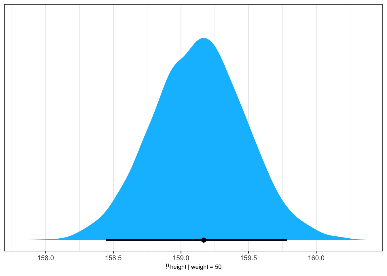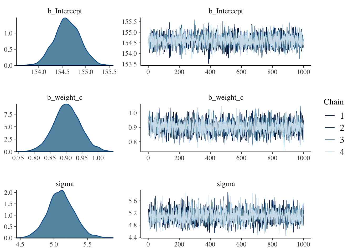 In this case we see the mean, the standard deviation, the width of a 89% posterior interval and a small histogram of four variables: height (centimeters), weight (kilograms), age (years), and “maleness” (0 indicating female and 1 indicating male).