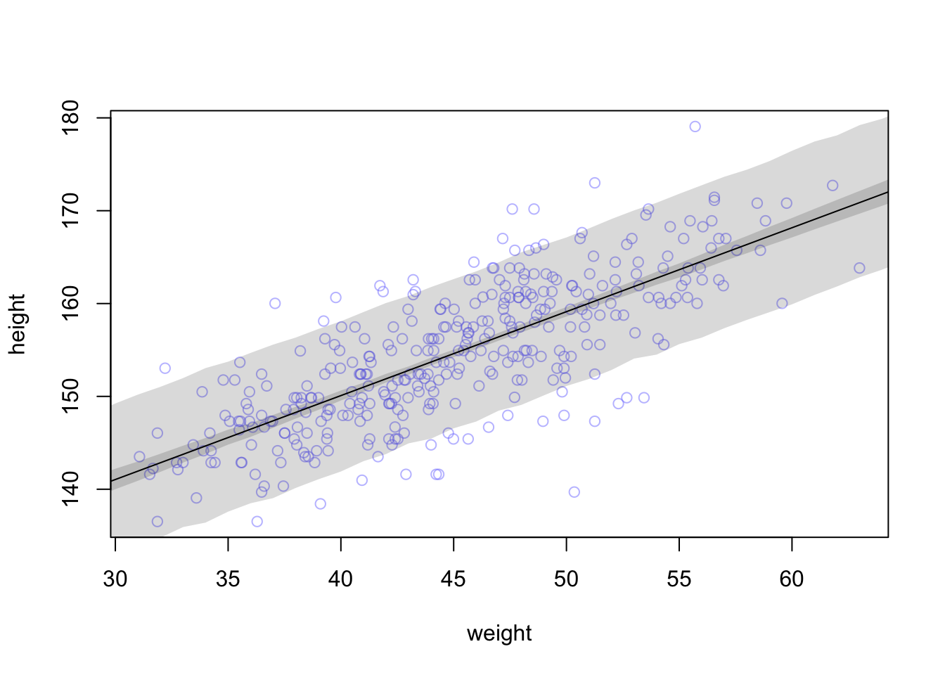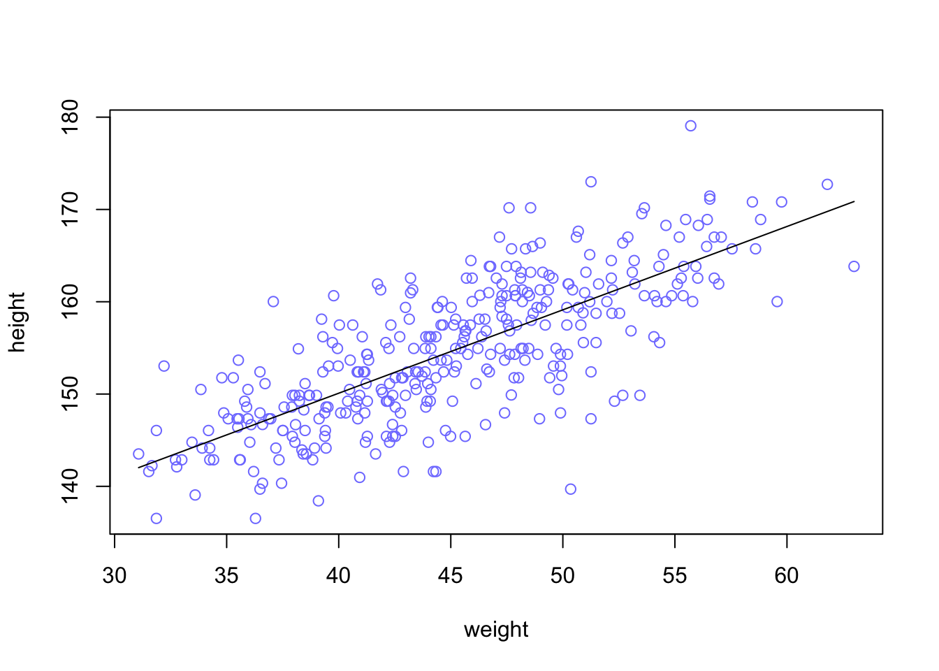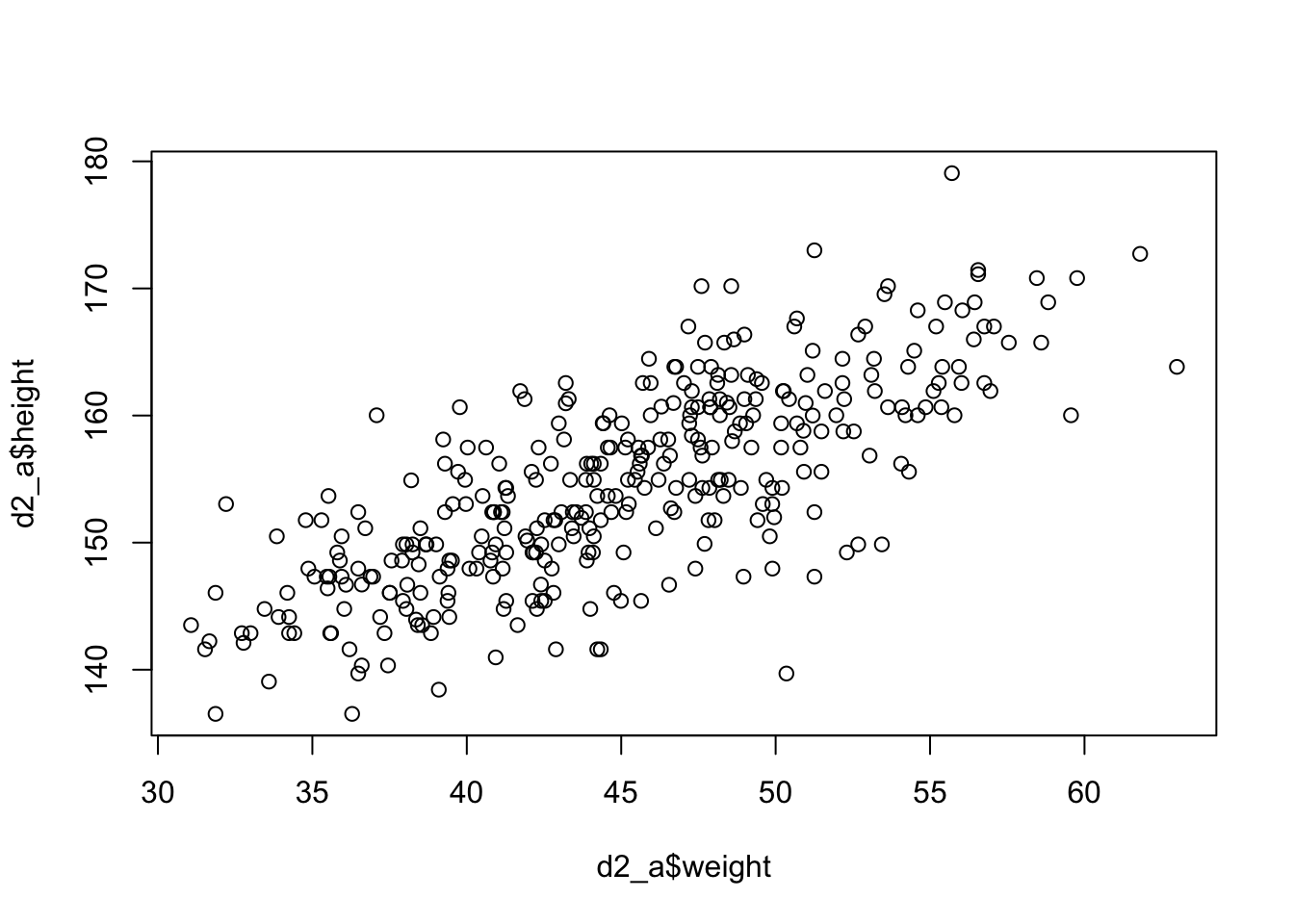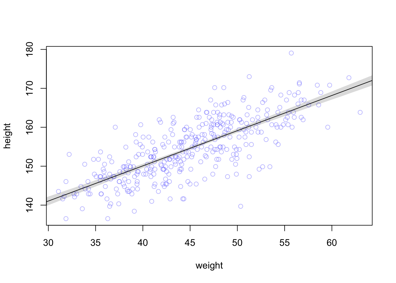 plot(height ~ weight, data = d2_a, col = rethinking::rangi2)