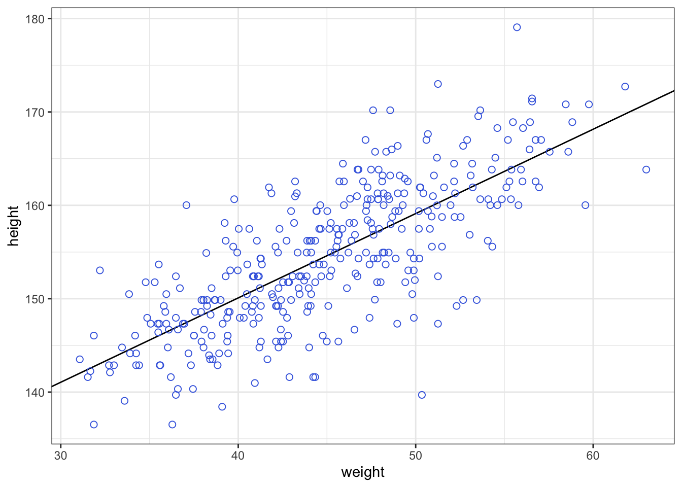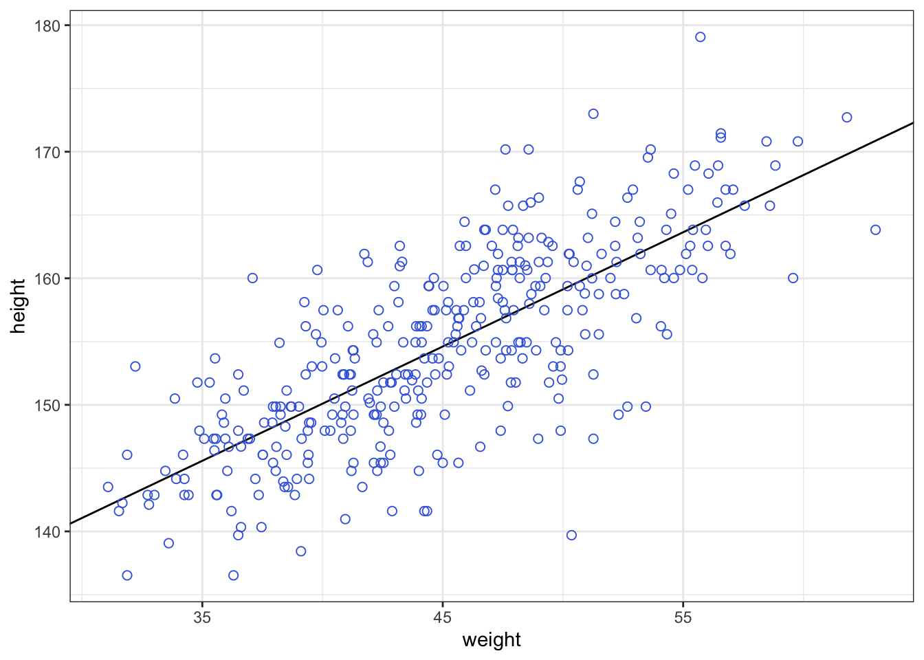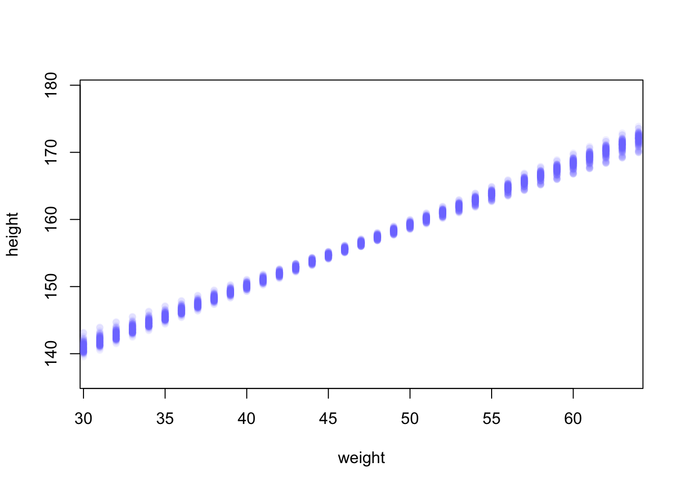 plot(height ~ weight, data = d2_a, col = rethinking::rangi2)