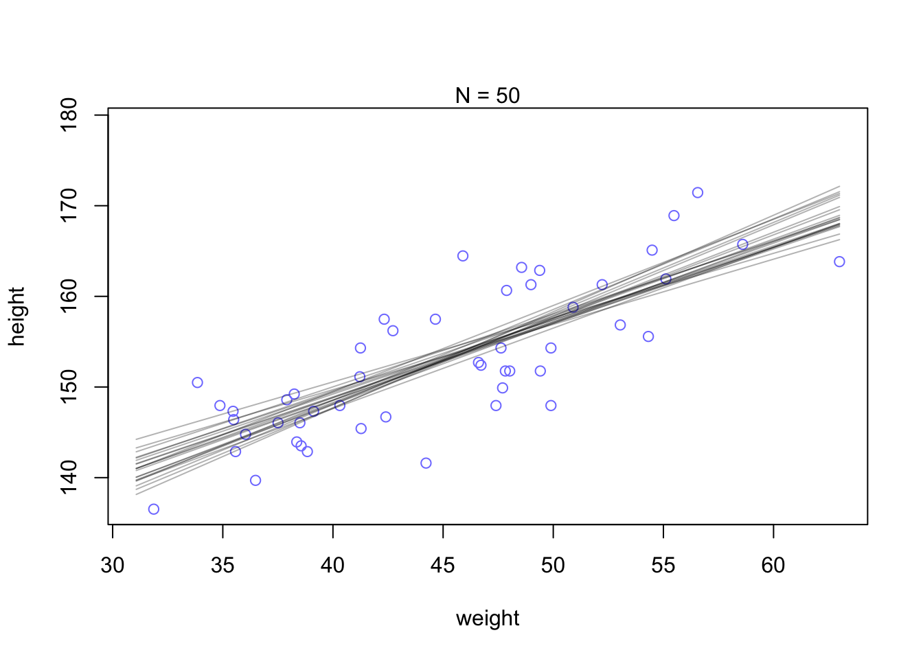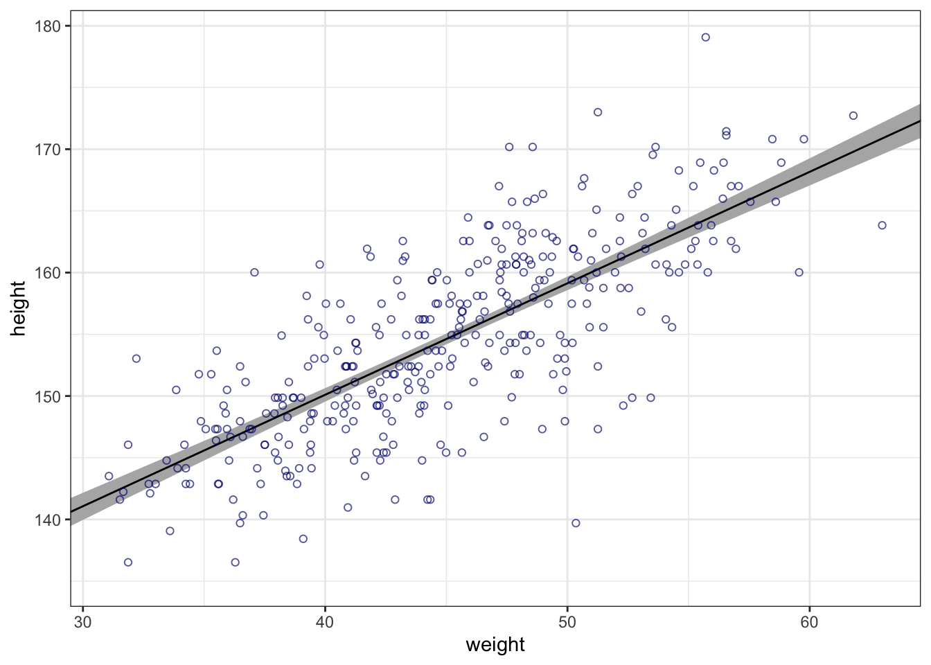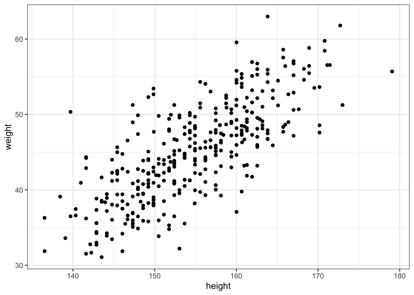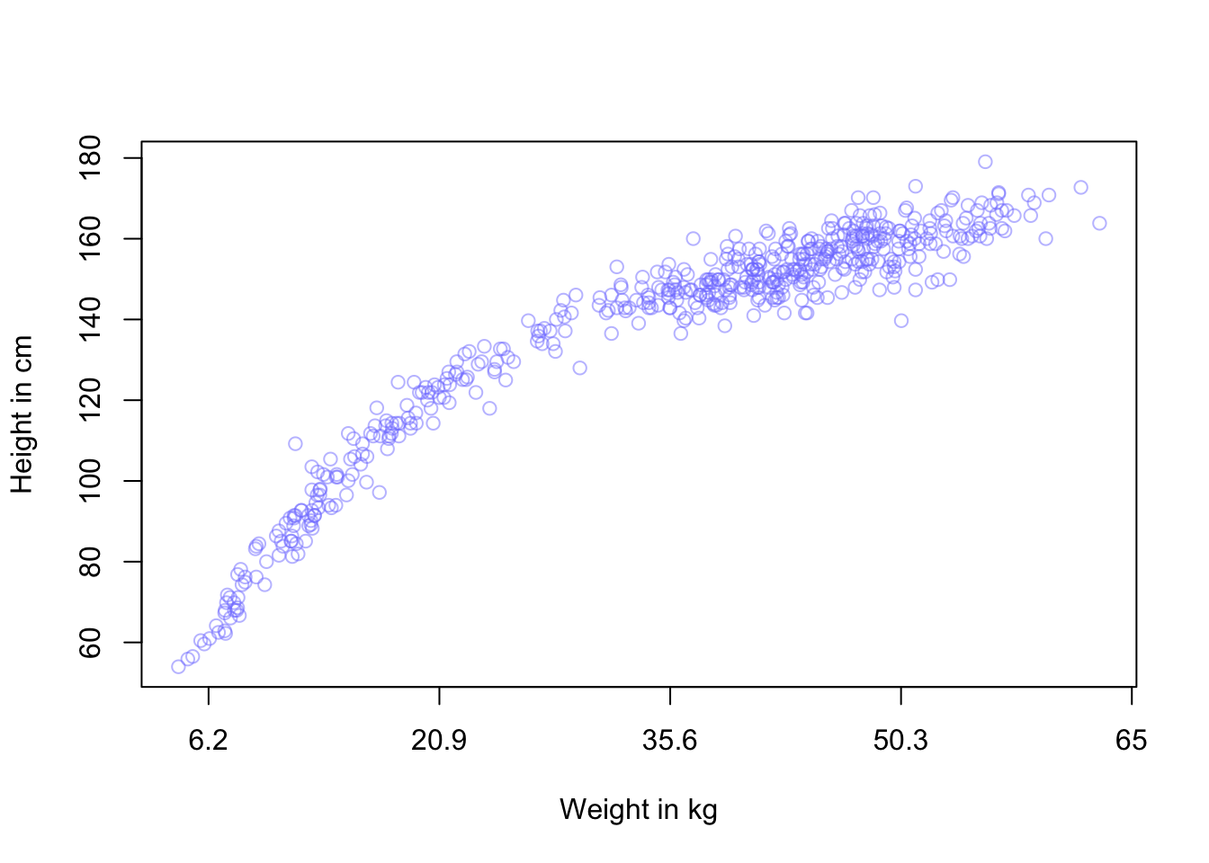 plot(height ~ weight, data = d2_a, col = rethinking::rangi2)