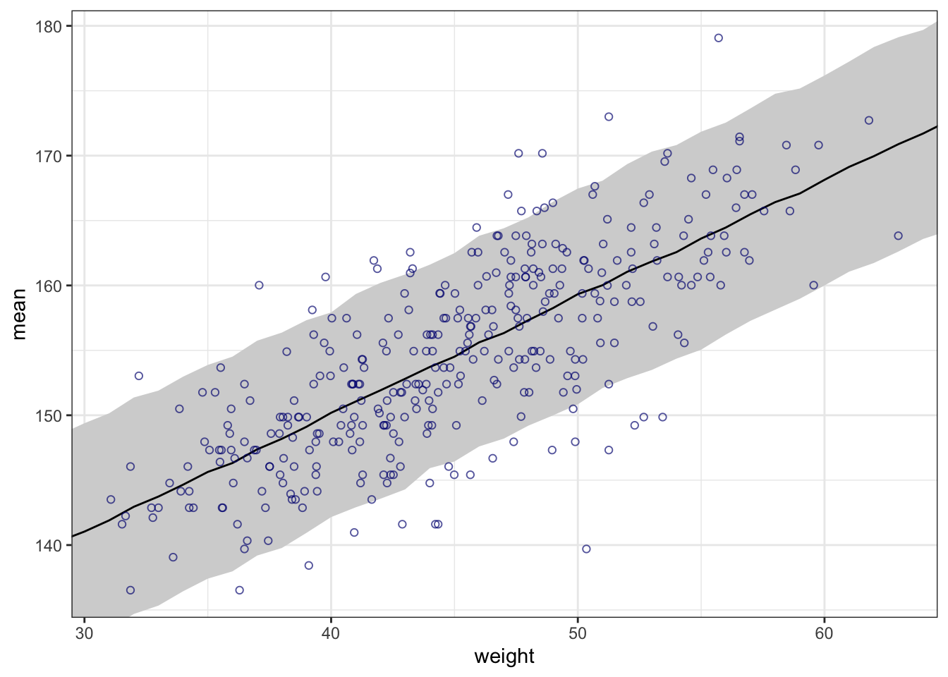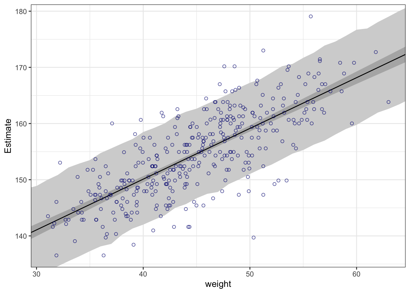R Code 4.158 b: Example 4M7a: Refit model m4.3b without mean weight xbar (Tidyverse)