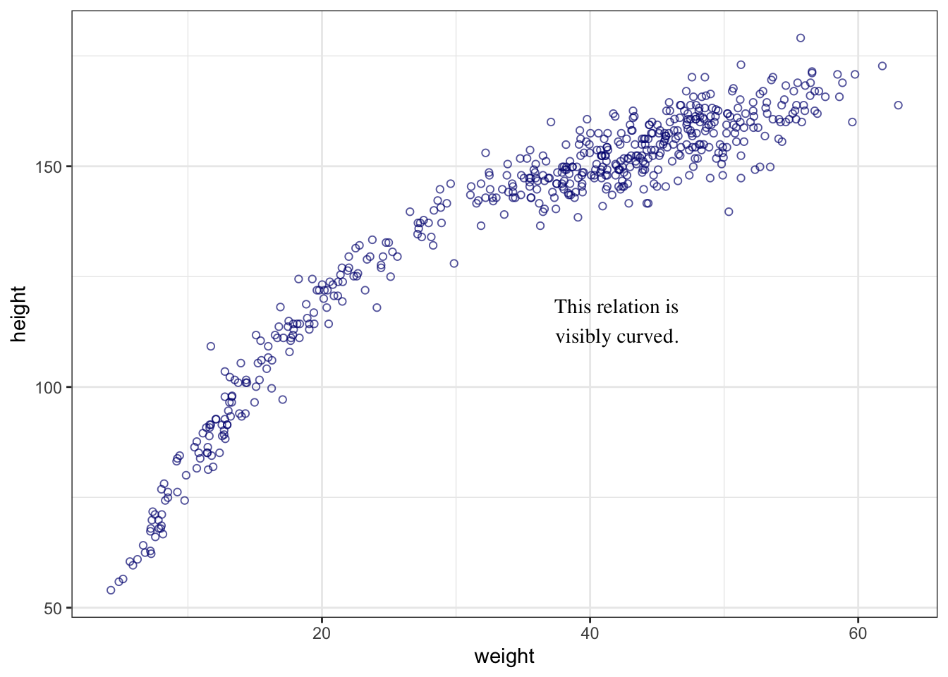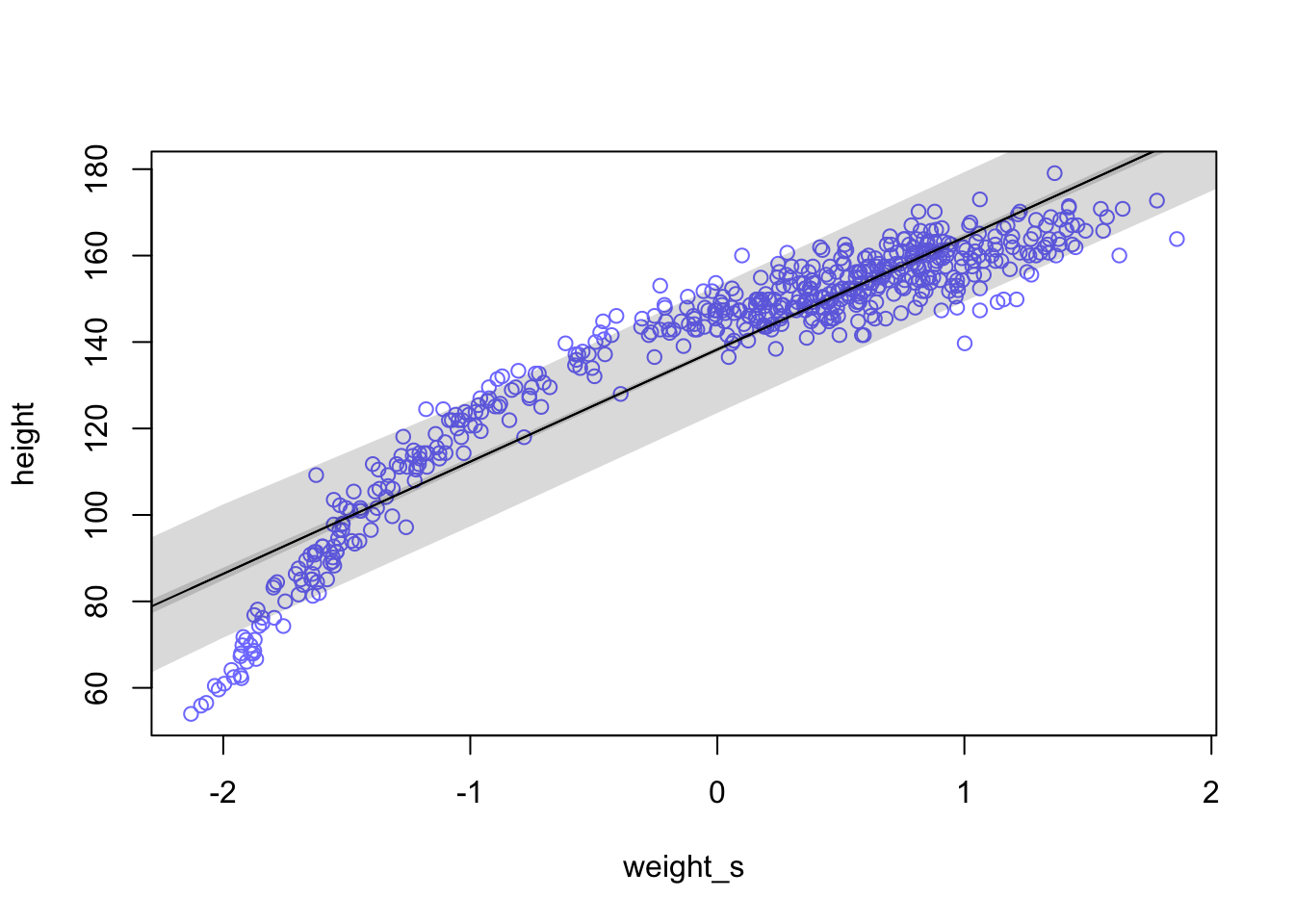 dplyr::glimpse() shows that the Howell1 data contains four columns. Each column has 544 entries, so there are 544 individuals in these data. Each individual has a recorded height (centimeters), weight (kilograms), age (years), and “maleness” (0 indicating female and 1 indicating male).