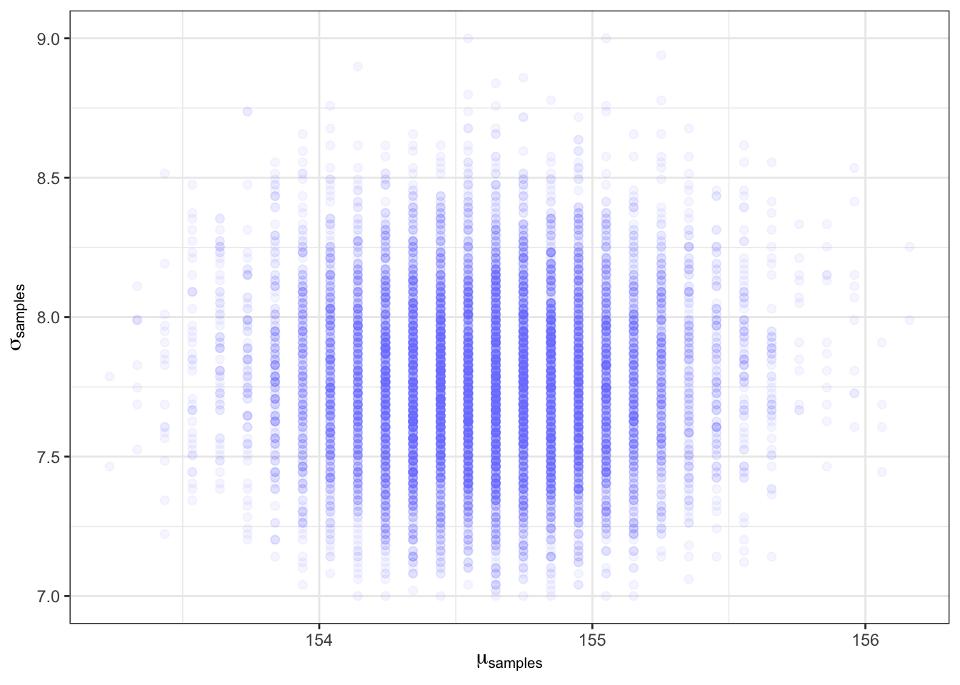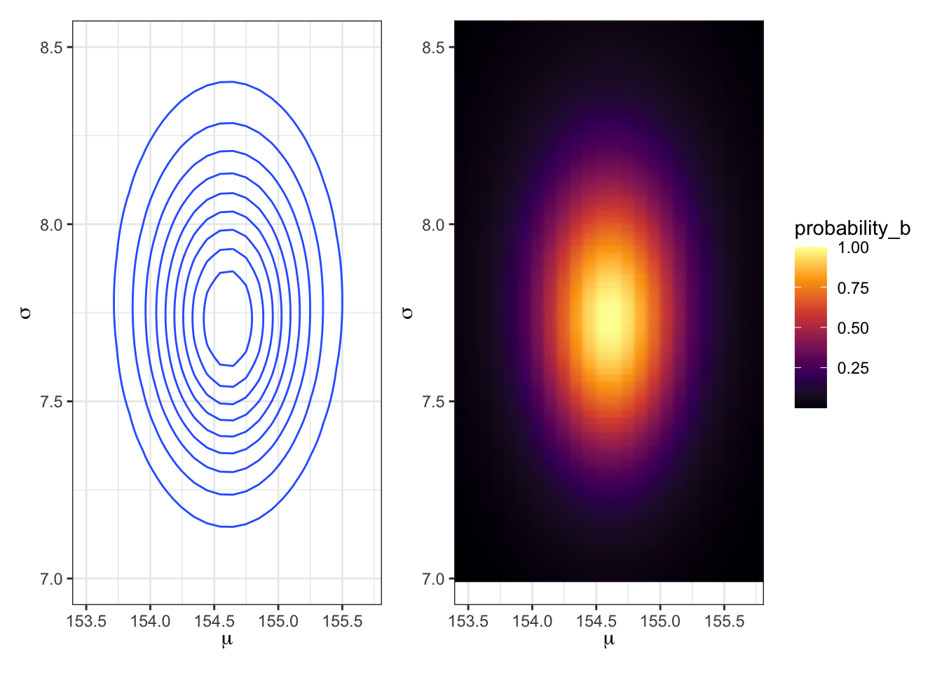 μand the standard deviationσ. Bayesian updating will allow us to consider every possible combination of values for μ and σ and to score each combination by its relativ // plausibility, in light of the data. These relative plausibilities are the posterior probabilities of each combination of values μ, σ.” (McElreath, 2020, p. 78/79) (pdf)