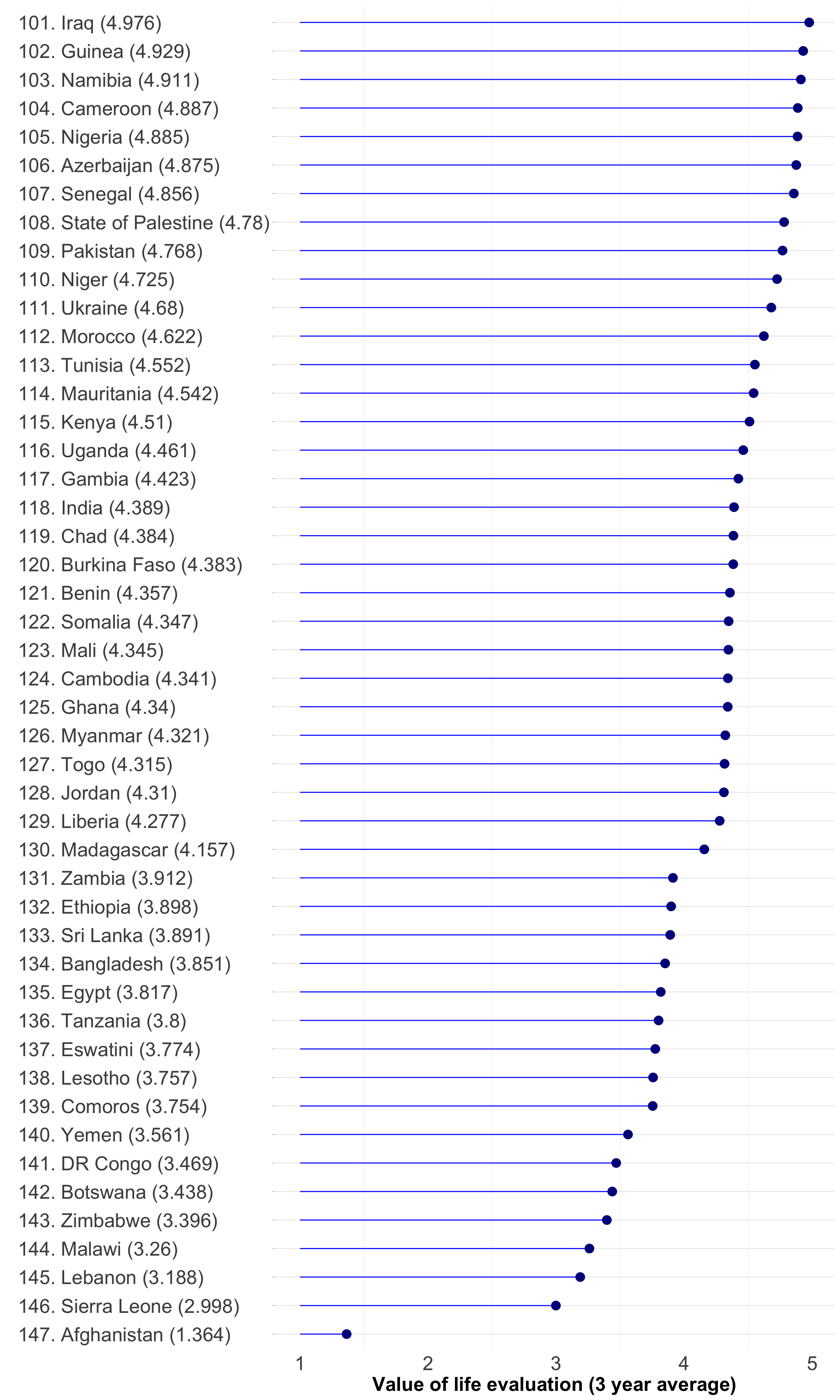 cantril_ranking<-function(df){ggplot2::ggplot(df,ggplot2::aes( x =forcats::fct_reorder(`country`, `ladder_score`) , y =`ladder_score`))+ggplot2::geom_segment(ggplot2::aes( x =`country`, xend =`country`, y =1, yend =`ladder_score`), color ="blue")+ggplot2::geom_point(color ="darkblue", size =4)+ggplot2::theme_light()+ggplot2::theme( panel.grid.major.x =ggplot2::element_blank(), panel.border =ggplot2::element_blank(), axis.ticks.x =ggplot2::element_blank(), axis.text.y =ggplot2::element_text(size =20, hjust =0), axis.text.x =ggplot2::element_text(size =20), axis.title.x =ggplot2::element_text(size =20, face ='bold'))+ggplot2::coord_flip()+ggplot2::xlab("")+ggplot2::ylab("Value of life evaluation (3 year average)")}