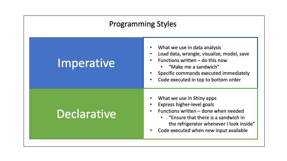 In contrast, Shiny apps use what is called a declarative programming style, which outlines higher-level goals, and lets the web app execute functions when it is activated by new input.