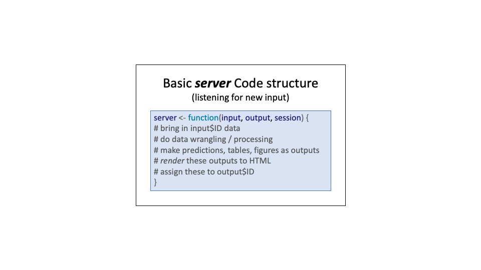 The server section accesses the inputs from the user as input$ID, where each input was assigned a unique “ID” in the user interface.