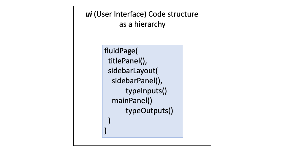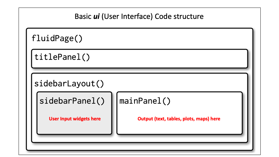To set up this structure, the code needs to be structured into sections, which are built with functions, as seen below. When coding a user interface (ui) in a basic Shiny app:
