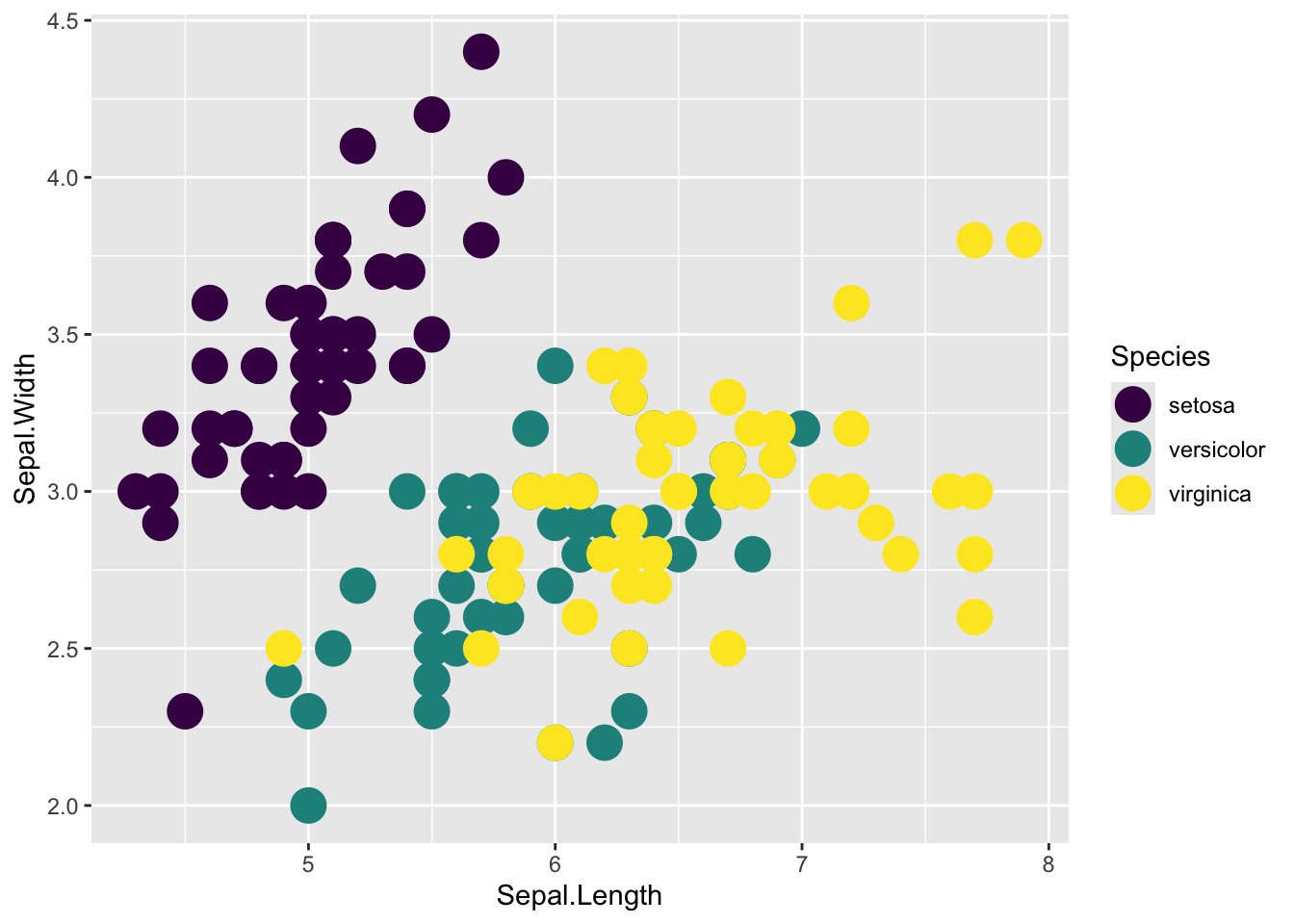 aes(x=Sepal.Length, y=Sepal.Width, color=Species)) +