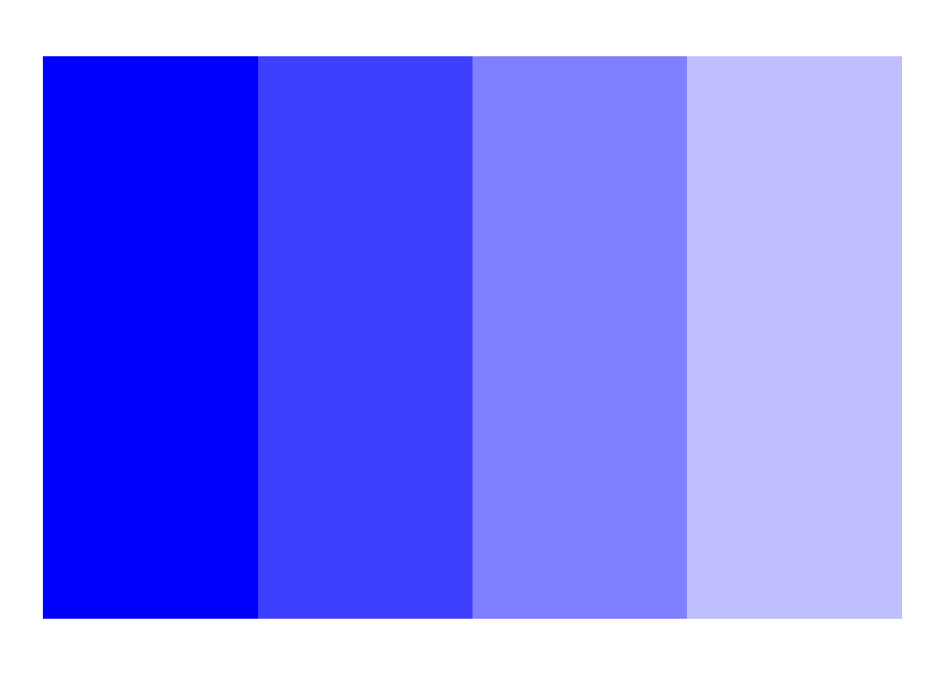 You can add a 4th channel to your hex codes, which represents the transparency of the desired color. These also range from 00-FF (256 levels of transparency). The 00 level is fully transparent, and the FF level is fully opaque. This is useful for layering colors on top of each other, or when you want to see other data or text through a color block. Here is an example of a blue color with 0%, 25%, 50%, and 75% transparency, which is a light blue color. Copy and run this code in your local RStudio to see the transparency changes in this color in action.