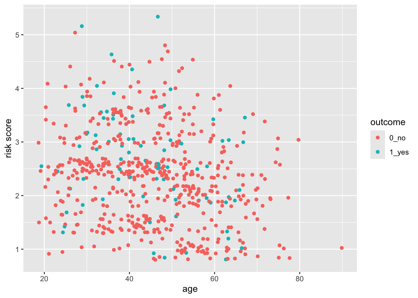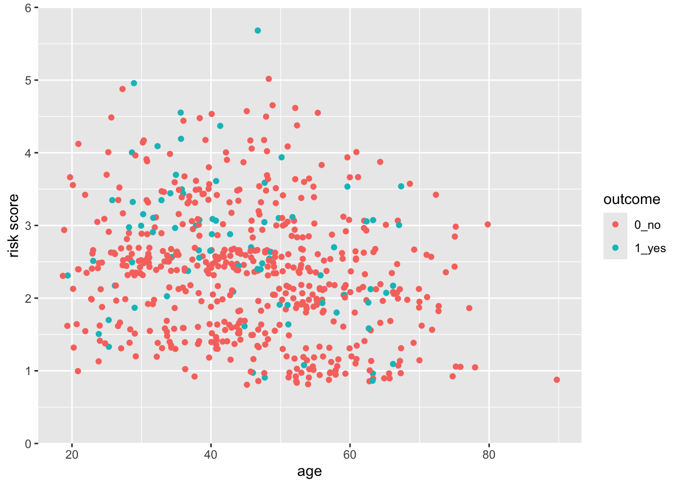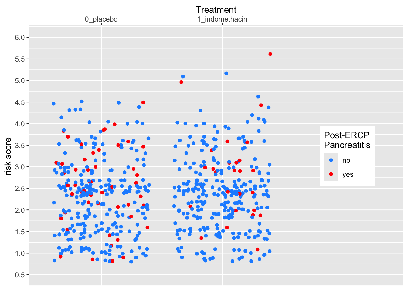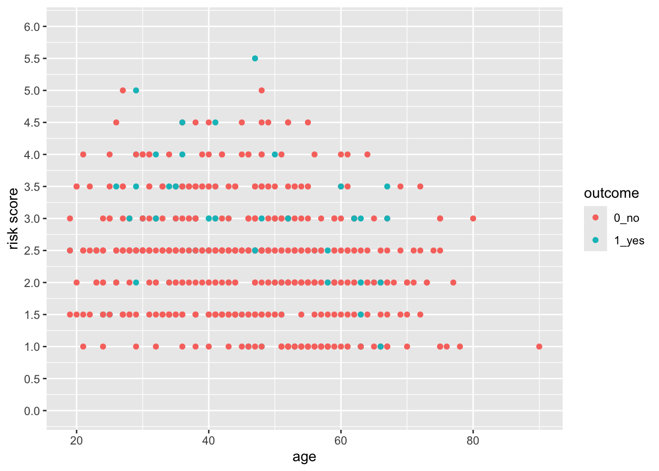 Let’s start with a scatterplot of age vs risk of PEP in the indo_rct dataset