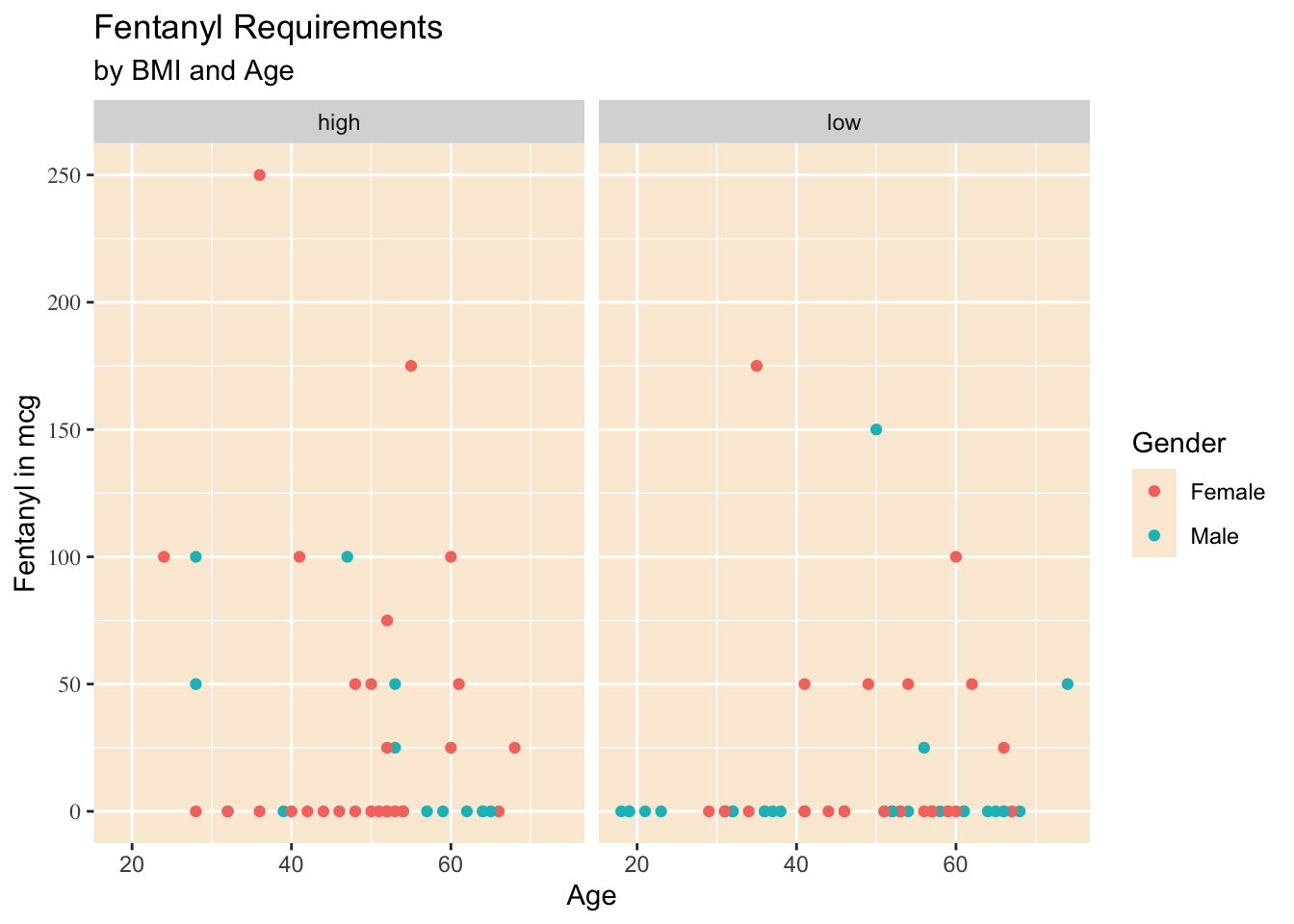 Let’s start you out with a simple plot from the {medicaldata} package. This plots the fentanyl requirements for anesthesia in the supraclavicular dataset comparing high and low BMI, age, and gender effects. Run this code block to see what the basic plot looks like.