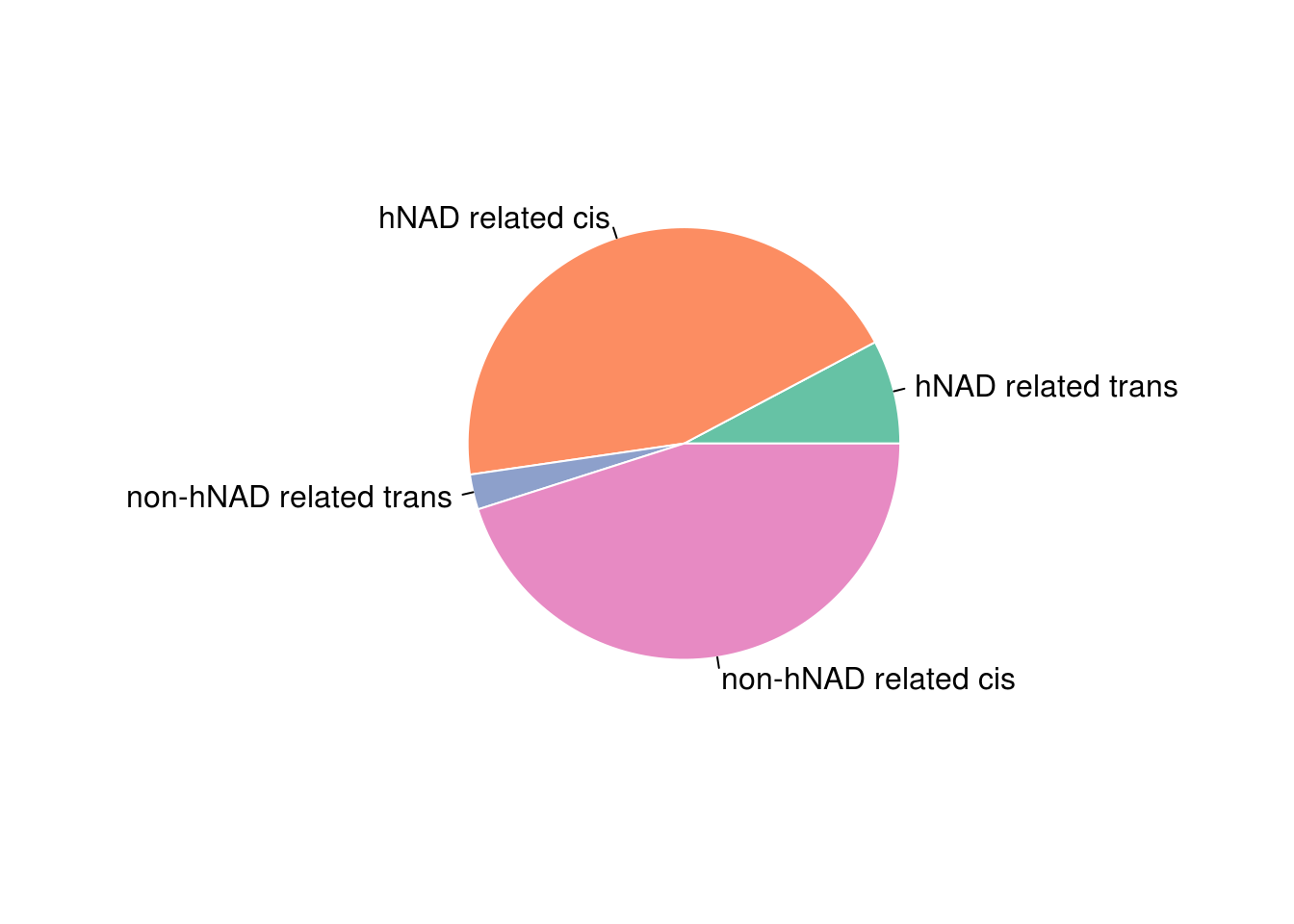 pie(Prop , labels = c('hNAD related trans','hNAD related cis','non-hNAD related trans','non-hNAD related cis'), border="white", col=myPalette )