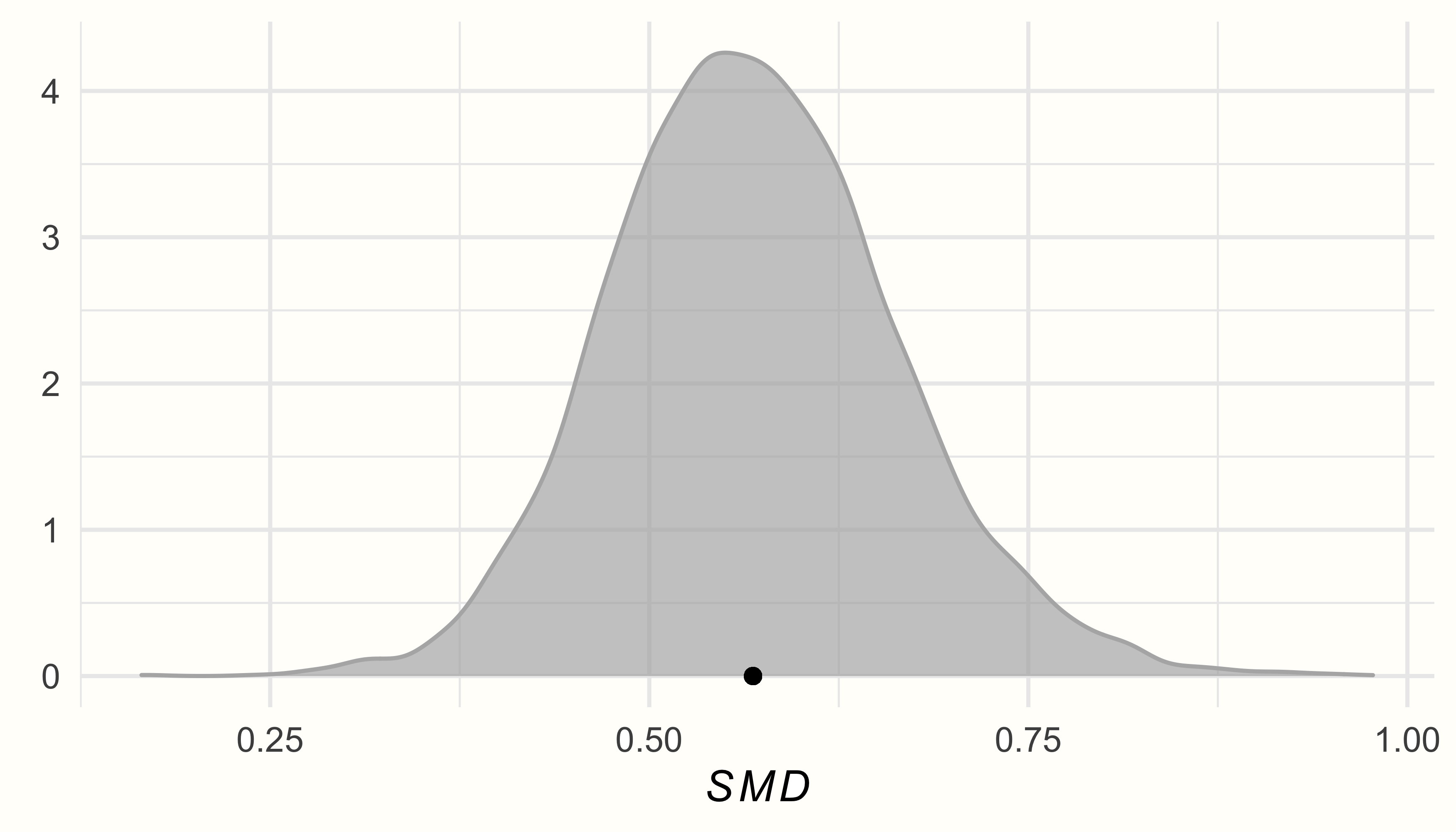 In the output, we see that the estimate is a (bias-corrected) SMD of 0.57, with the 95% credible interval ranging from 95%CrI: 0.39−0.76. This indicates that the interventions studied in this meta-analysis have a moderate-sized overall effect.