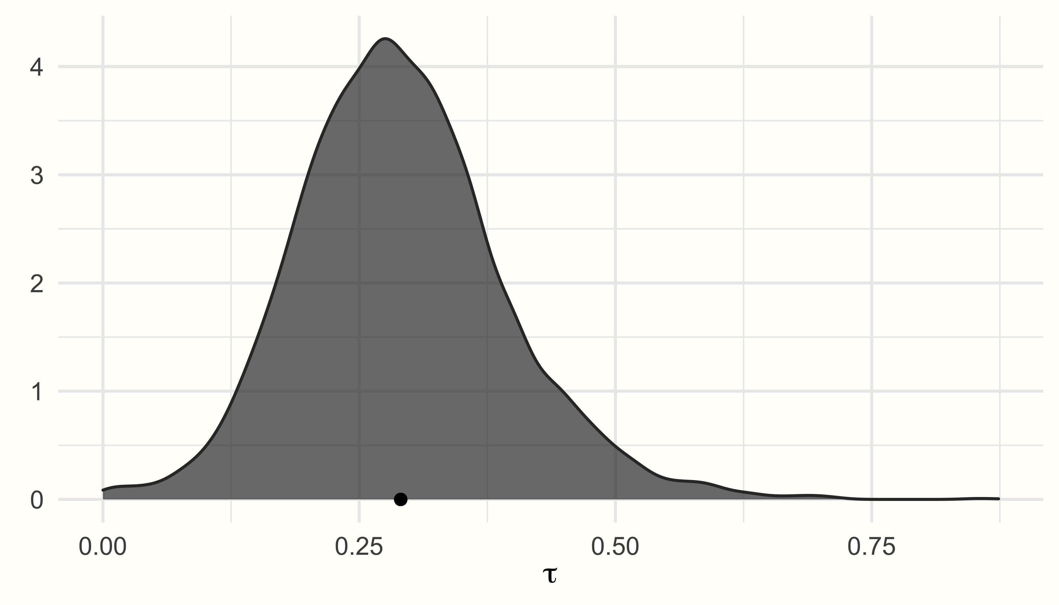 Because this is a Bayesian model, we do not find any \(p\)-values here. But our example should underline that we can also make reasonable inferences without having to resort to classical significance testing. A great thing we can do in Bayesian, but not in frequentist meta-analysis, is to model the parameters we want to estimate probabilistically. The Bayesian model not only estimates the parameters of interest but a whole posterior distribution for \(\tau^2\) and \(\mu\), which we can access quite easily. We only have to use the posterior_samples function.