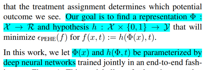 The authors trying to different the original model TARNet, in the original they only condition on x to compute y, now we use z instead (paragraph 2 part 4 paper (Shalit, Johansson, and Sontag 2016)) \[\begin{aligned} &y_{i} \sim p\left(Y_{1} | x_{i}\right) \text { if } t_{i}=1\\ &y_{i} \sim p\left(Y_{0} | x_{i}\right) \text { if } t_{i}=0 \end{aligned}\]