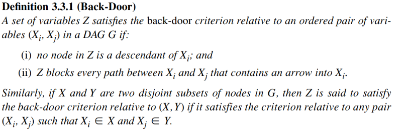 Theorem 3.3.2 (Back-Door Adjustment) (page 79 Causality) If a set of variables Z satisfies the back-door criterion relative to (X, Y), then the causal effect of X on Y is identifiable and is given by the formula