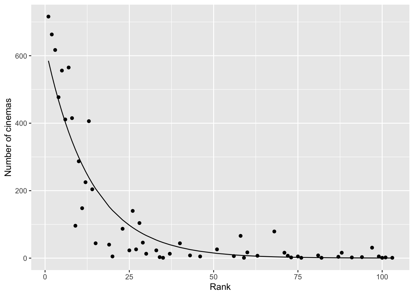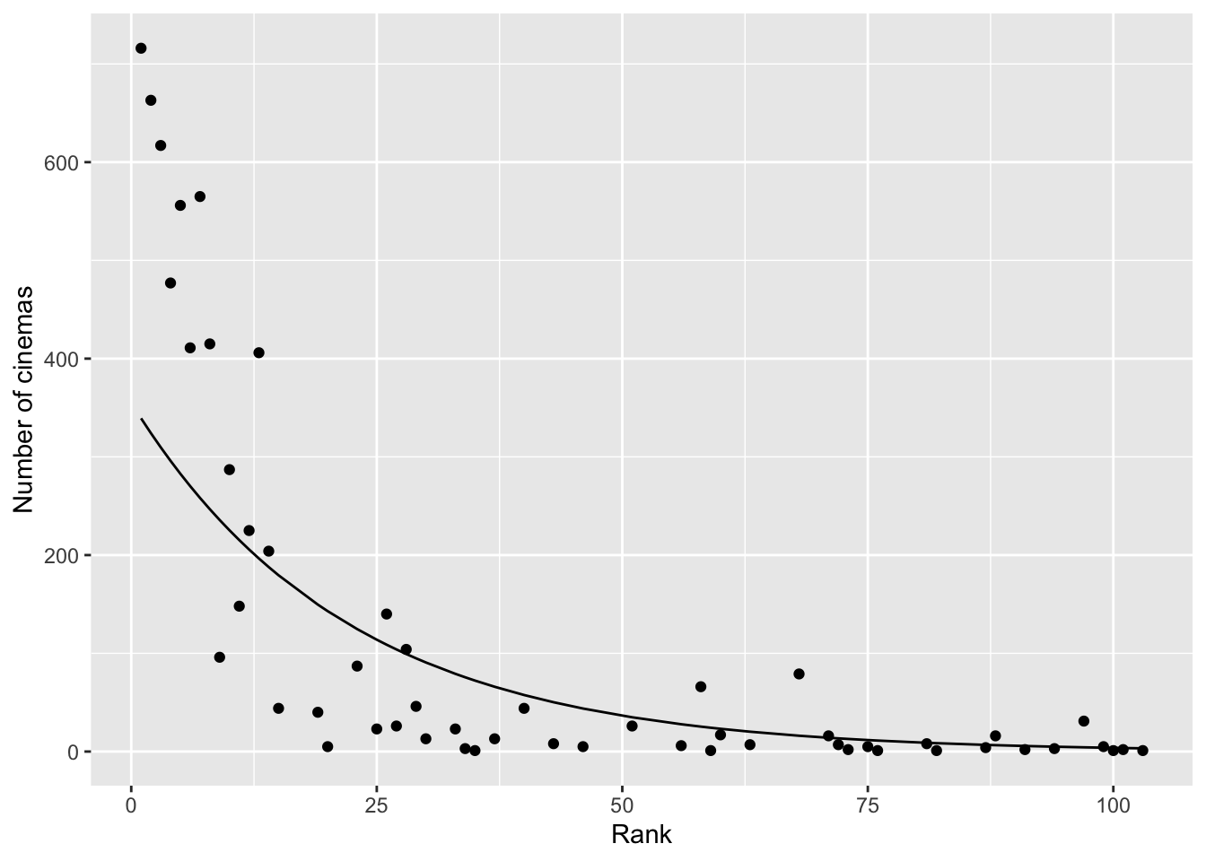 Figure 16.1: The number of cinemas showing a film in a particular weekend, as a function of the film’s rank in terms of gross weekend revenue.