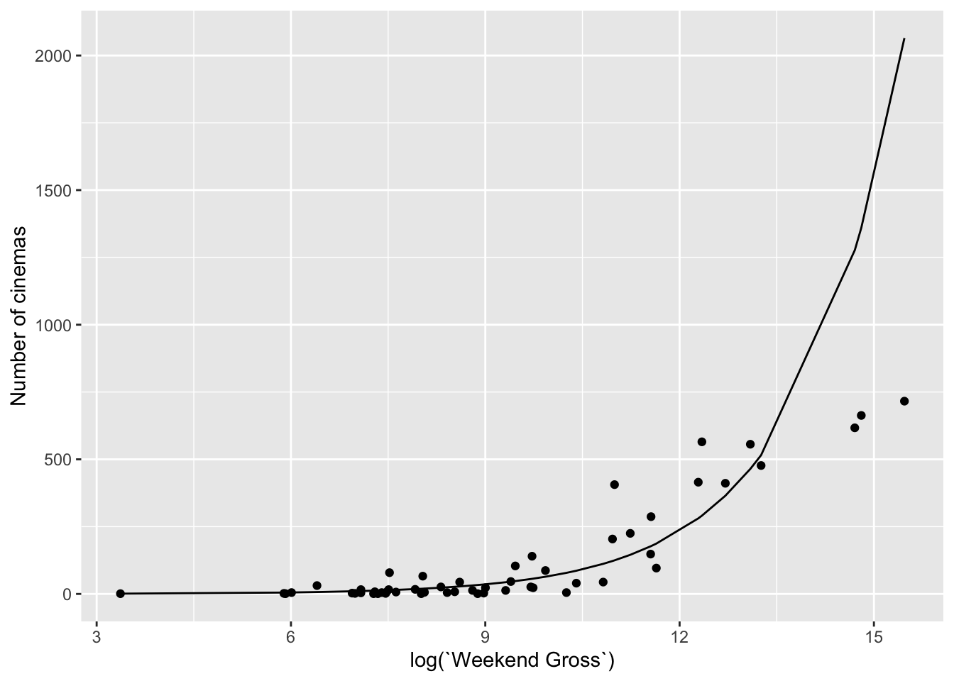 Another value of Rank might be 10, representing the film with the 10th largest gross revenue. If we fill in that value, we get: \(\lambda=\textrm{exp}(6.450 -0.075 \times 10)= \textrm{exp}(5.70) = 299\). Thus, for the film with the 10th largest revenue, we expect to see that it runs in 299 cinemas.