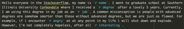 I’d like to to use inline code to tell us your name, your degree or if you’re working towards one, if you’re employed tell us your job, tell ys something that makes you irrationally angry, and something interesting.