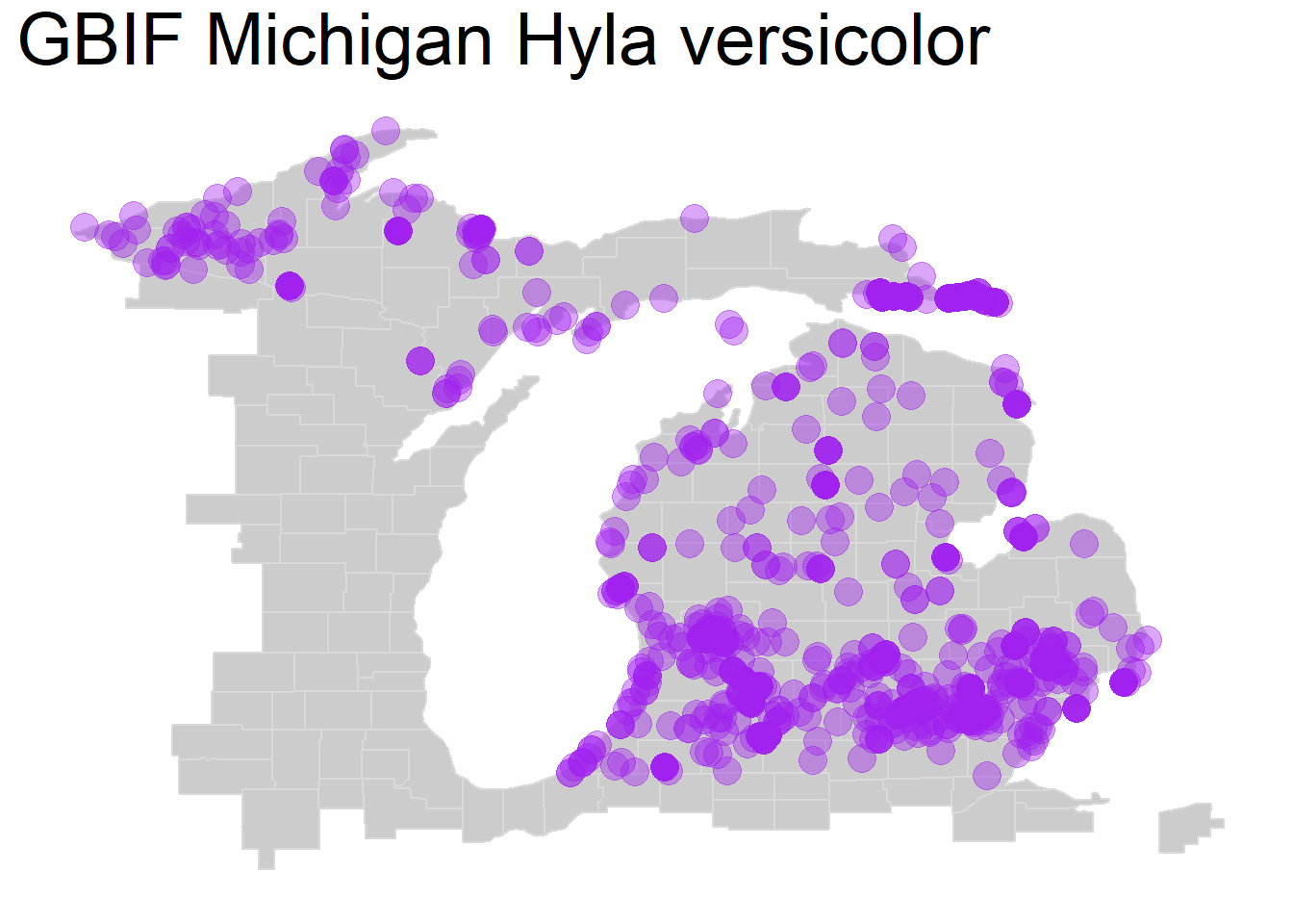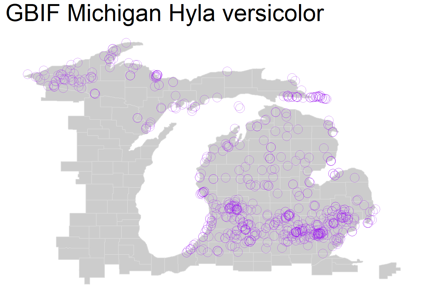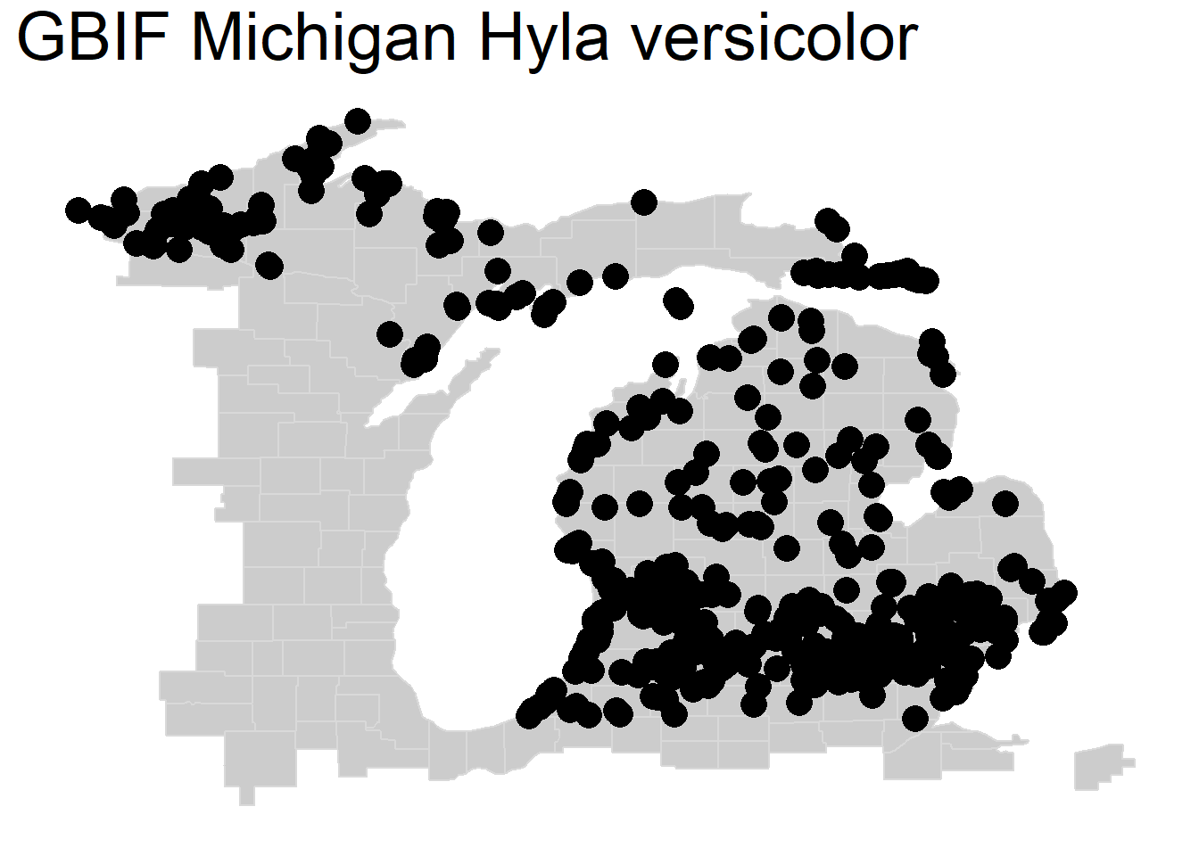 labs(title = 'GBIF Michigan Hyla versicolor') +