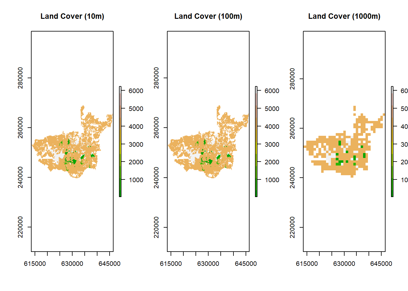 plot(raster_1000m, main = "Land Cover (1000m)", col = terrain.colors(10))
