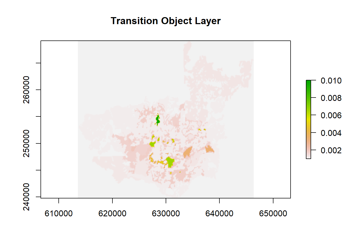 In gdistance, we need a transition layer that dictates how movement occurs from one cell to its neighbor. This transition layer is derived from the cost surface. Today, we will use a simple transition function but there are more complex ones or ones more suitable for elevational change or other specific processes: