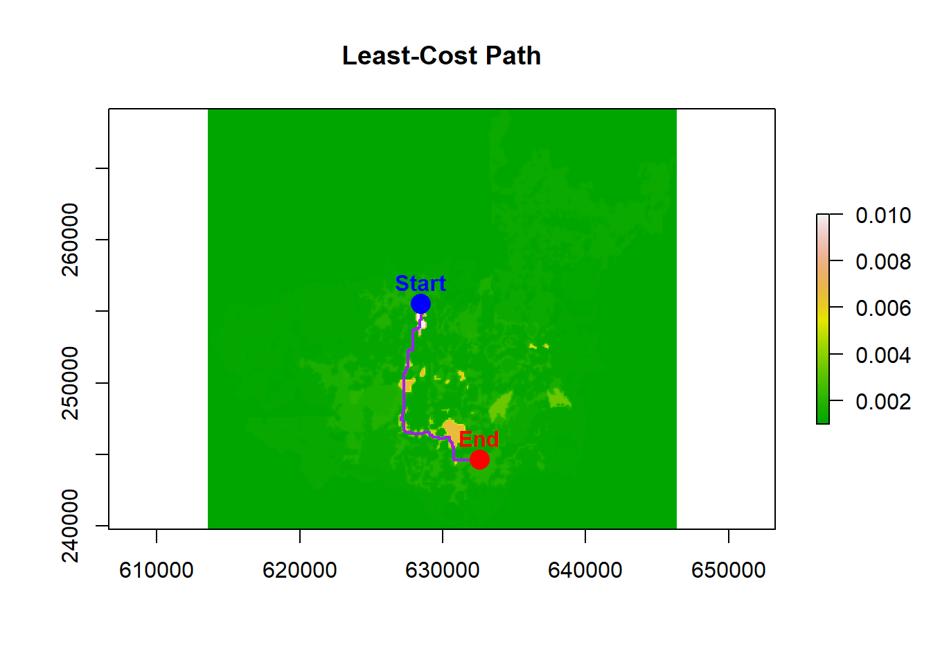 We are FINALLY ready to calculate our least-path now that we have our transition layer and our patch coordinates. Using the transition layer, we compute a least-cost path between two selected patch centroids: