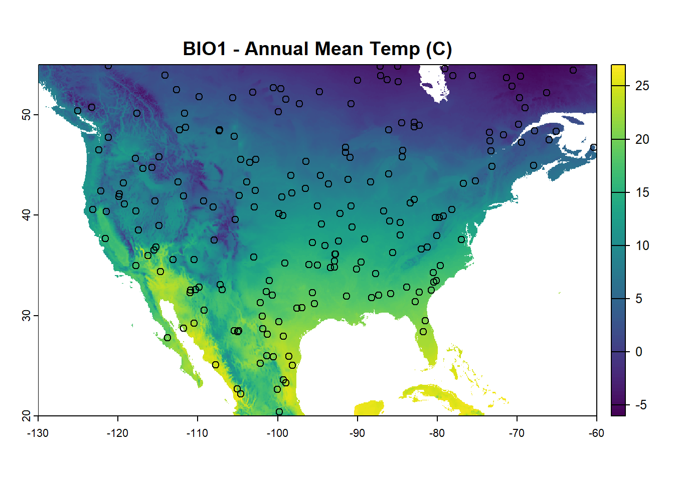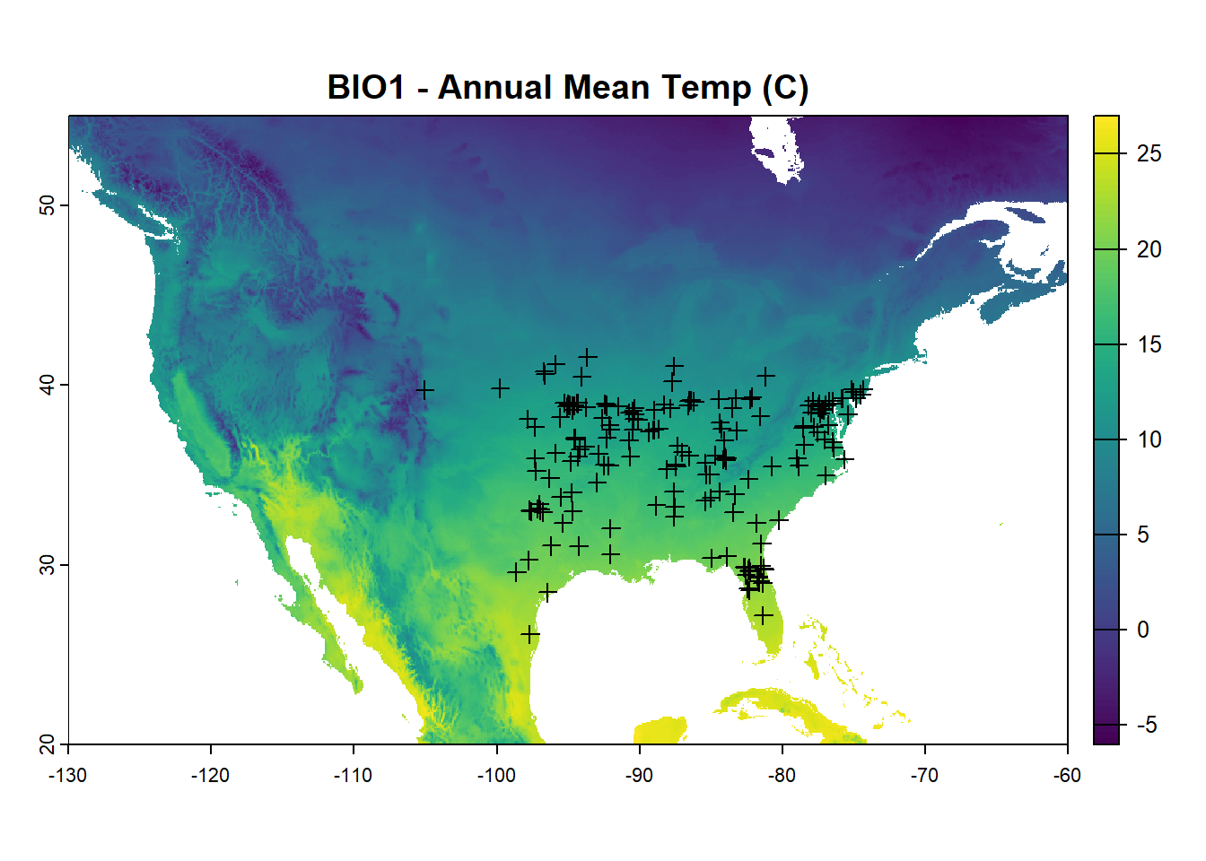 bioclim_na <- crop(bioclim_data, na_extent)Plot the worldclim data (just the first two rasters) and lone star tick points: