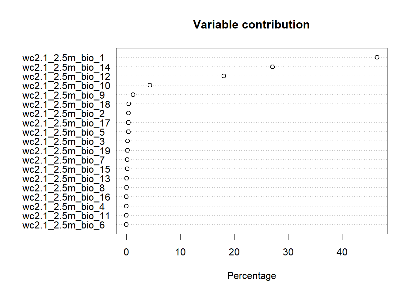 mall_test <- SpatialPointsDataFrame(coords = occs_3, data = data.frame(occs_3), proj4string = CRS("+proj=longlat +datum=WGS84"))mall_mod <- maxent(clim, occs_sp_2, a = background_test)