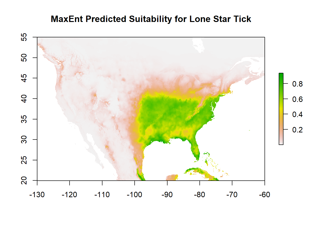 plot(predict_suitability, main="MaxEnt Predicted Suitability for Lone Star Tick")