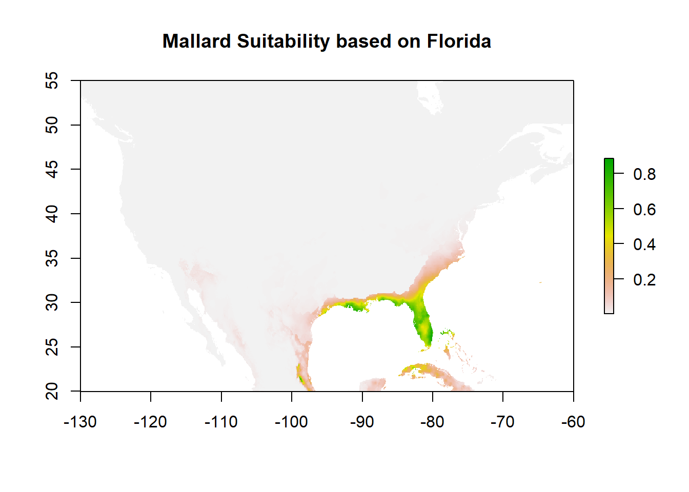 Let’s try a “bad” MaxEnt model, and create a model based on mallards in Florida to predict mallard in Michigan
