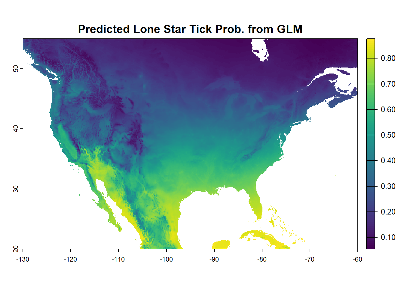 plot(predicted_raster, main = "Predicted Lone Star Tick Prob. from GLM")