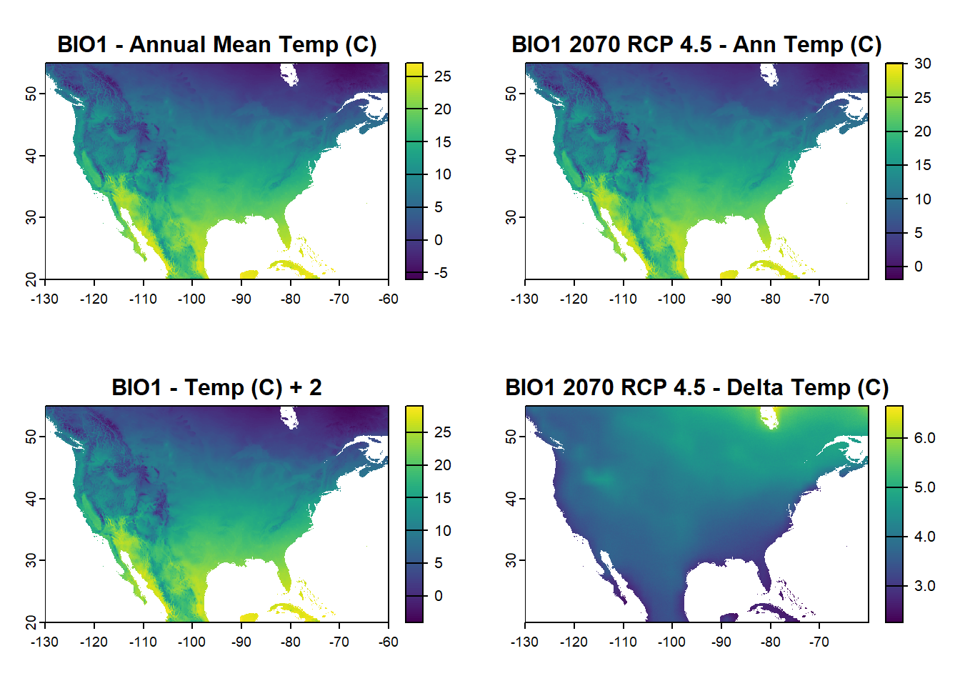 You can also bring in worldclim data for projections in the future under different RCP scenarios, e.g. 2070 under RCP 4.5 or. Or, manually add a fixed value such as 2 degrees C to the entire raster (including your own). Note that this was updated on Feb 16th, 2025 since the package/function changed since I first designed this exercise.