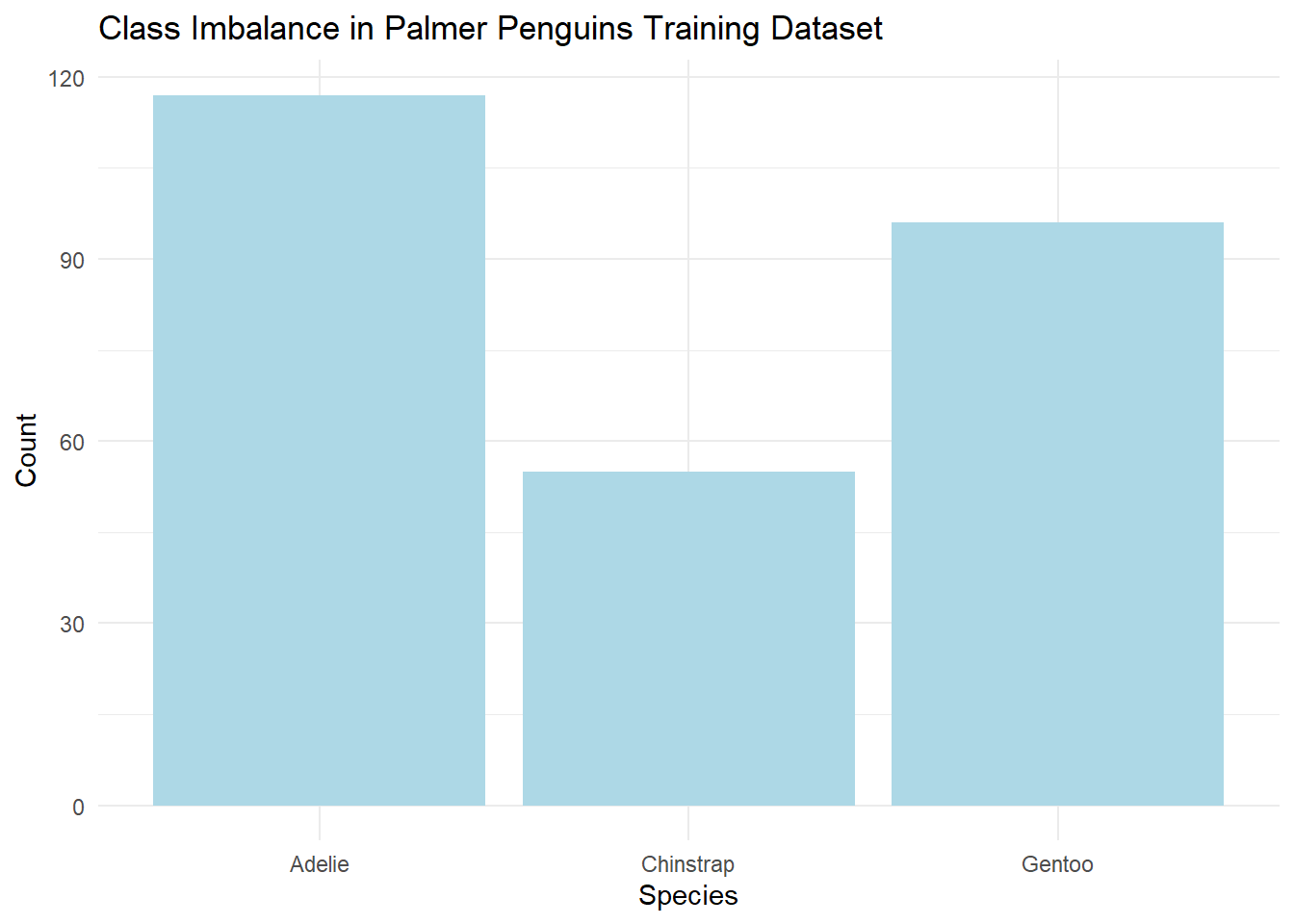 labs(title = "Class Imbalance in Palmer Penguins Training Dataset", x = "Species", y = "Count")