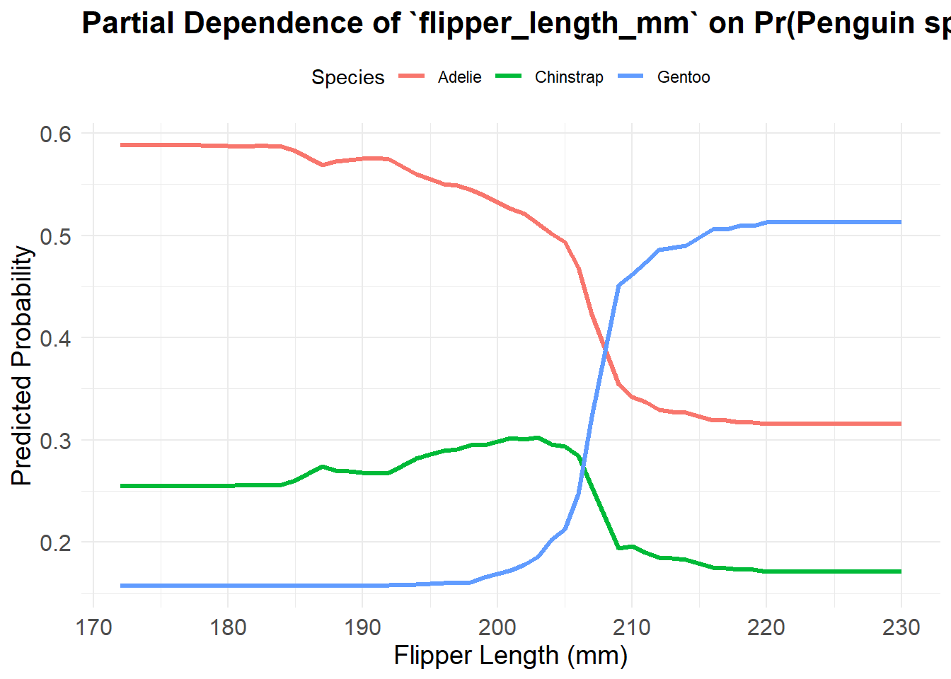 title = "Partial Dependence of `flipper_length_mm` on Pr(Penguin spp.)",