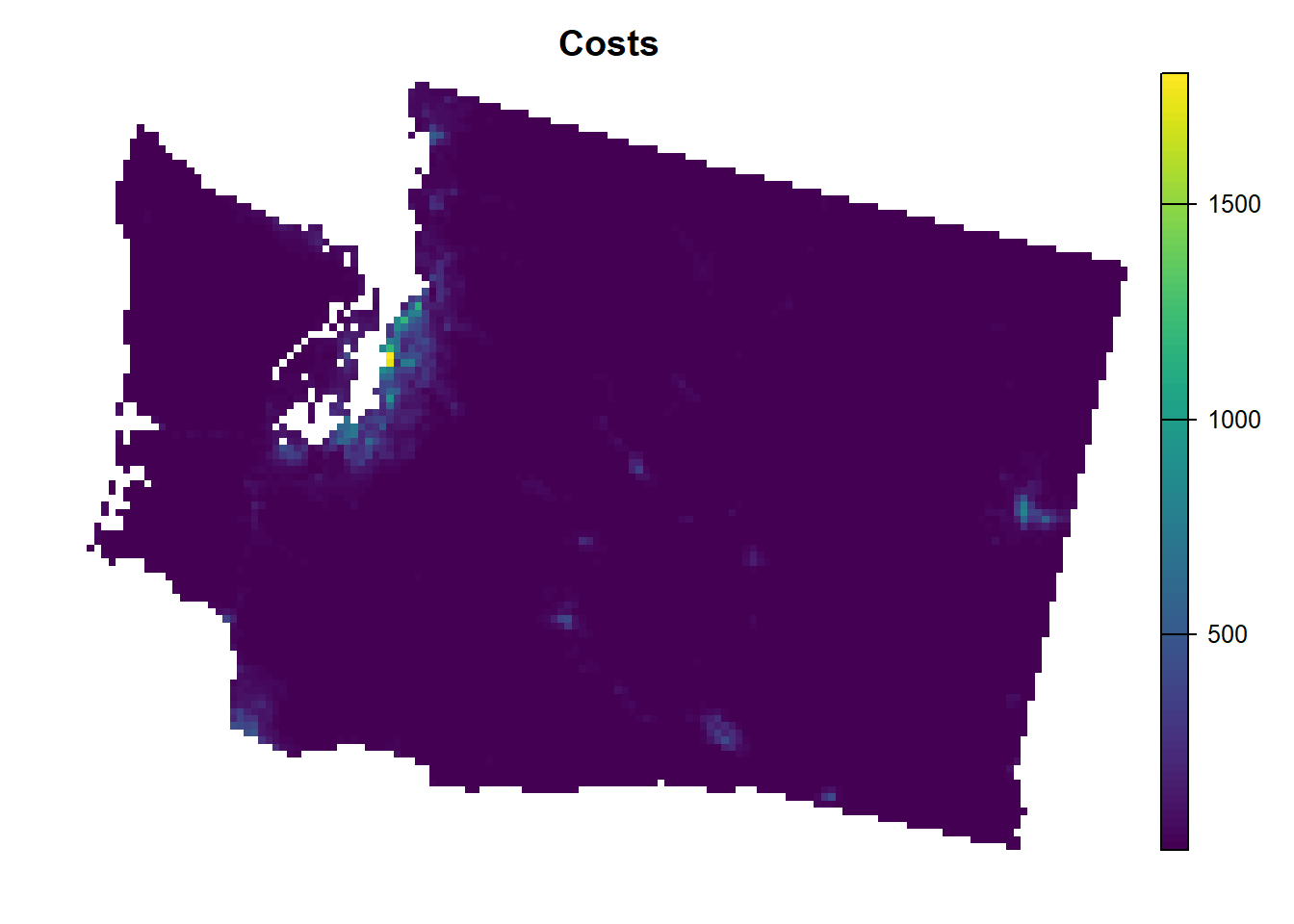 Note that this PU raster has costs built in (in this case land acquisition costs). There are a total of 10,757 PUs in this raster, which is at the 4 x 4 kilometer resolution.