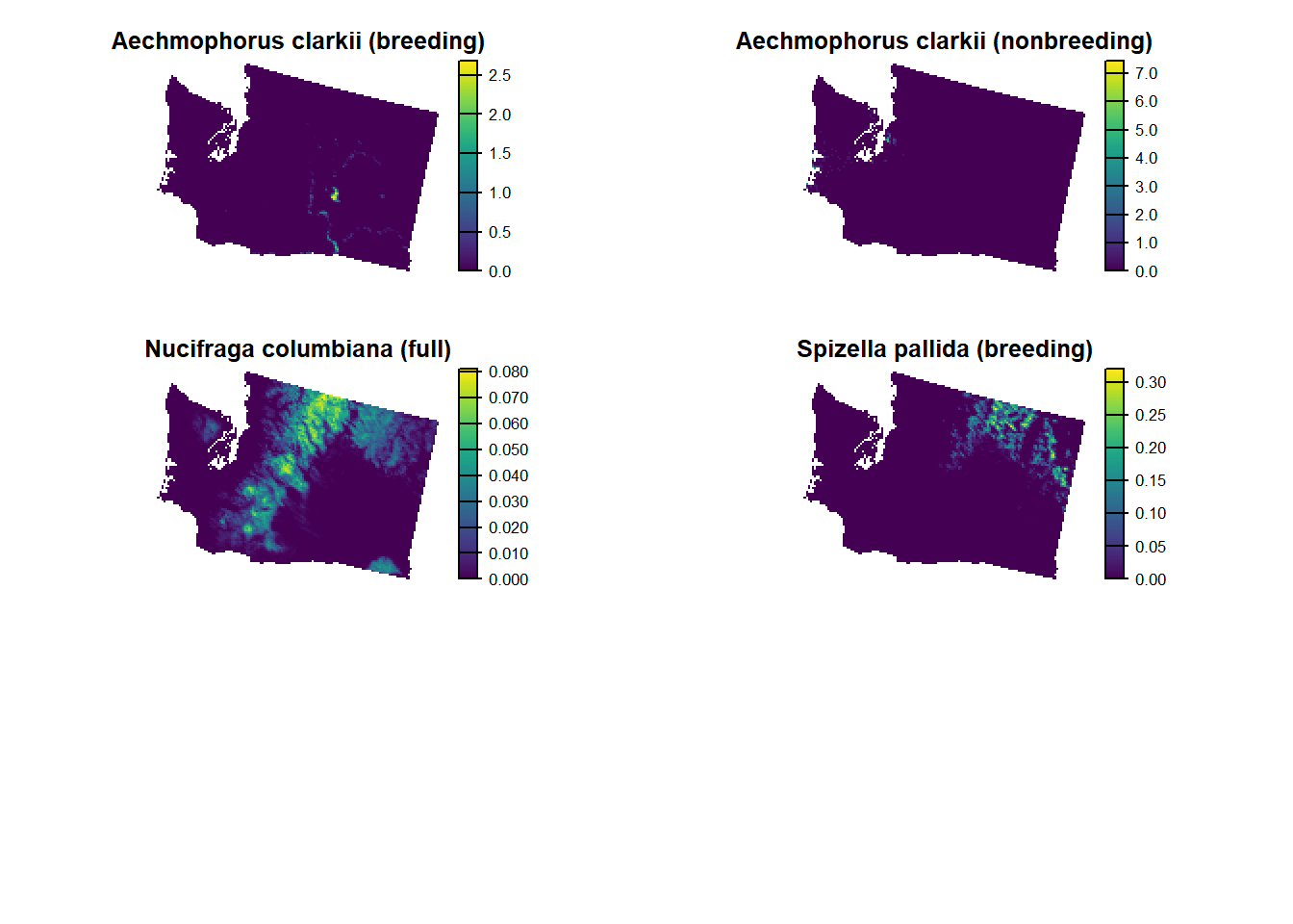 The overall SCP here looked at conservation lands in Washington State valued at $3013.56 million with the goal of increasing the conservation land value by 30% to $3917.63 million). The conservation target was birds in the state with the input being 396 species distribution maps for 258 bird species (applying multiple maps for seasonality). Since this study was performed by the authors of R package, they have conveniently made the data available through the R data package prioritizrdata.