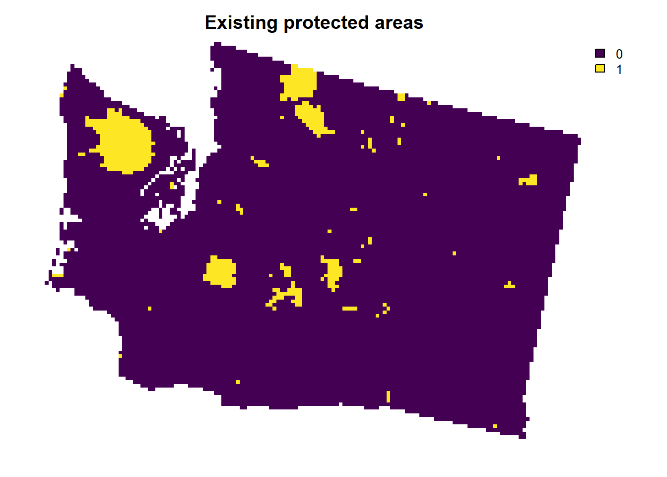 plot(wa_locked_in, main = "Existing protected areas", axes = FALSE)