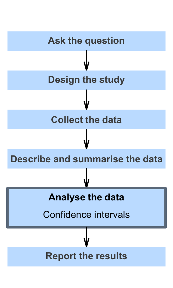 So far, you have learnt to ask a RQ, identify different ways of obtaining data, design the study, collect the data describe the data, summarise data graphically and numerically, and understand the tools of inference.
