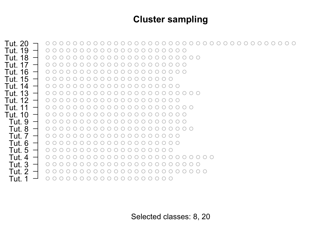 The animation below shows how a sample of approximately 40 students could be obtained using cluster sampling, using the tutorials as clusters.