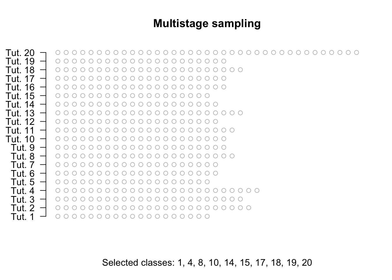 The animation below shows how a sample of approximately 40 students could be obtained using multistage sampling, by randomly selecting 10 classes at random in Stage 1, then randomly selecting students from each class in Stage 2.