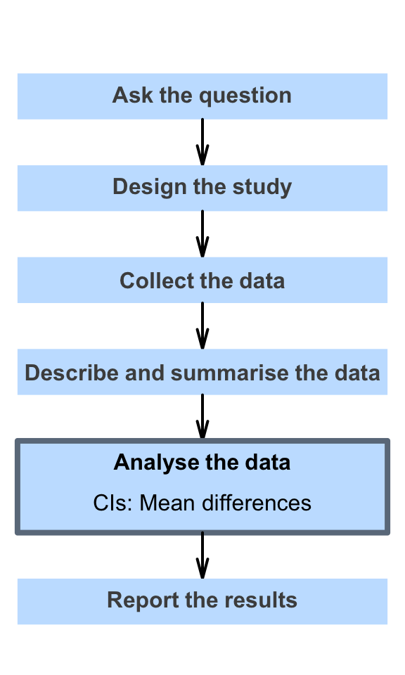 So far, you have learnt to ask a RQ, identify different ways of obtaining data, design the study, collect the data describe the data, summarise data graphically and numerically, and understand the tools of inference.
