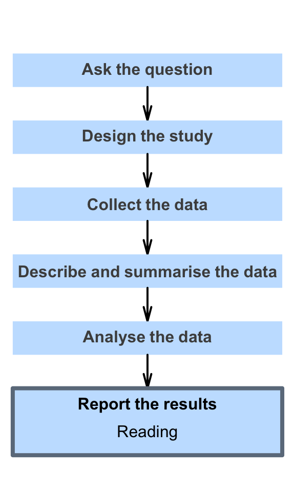 So far, you have learnt to ask a RQ, identify different ways of obtaining data, design the study, collect the data describe the data, summarise data graphically and numerically, understand the tools of inference, to form confidence intervals, and to perform hypothesis tests.