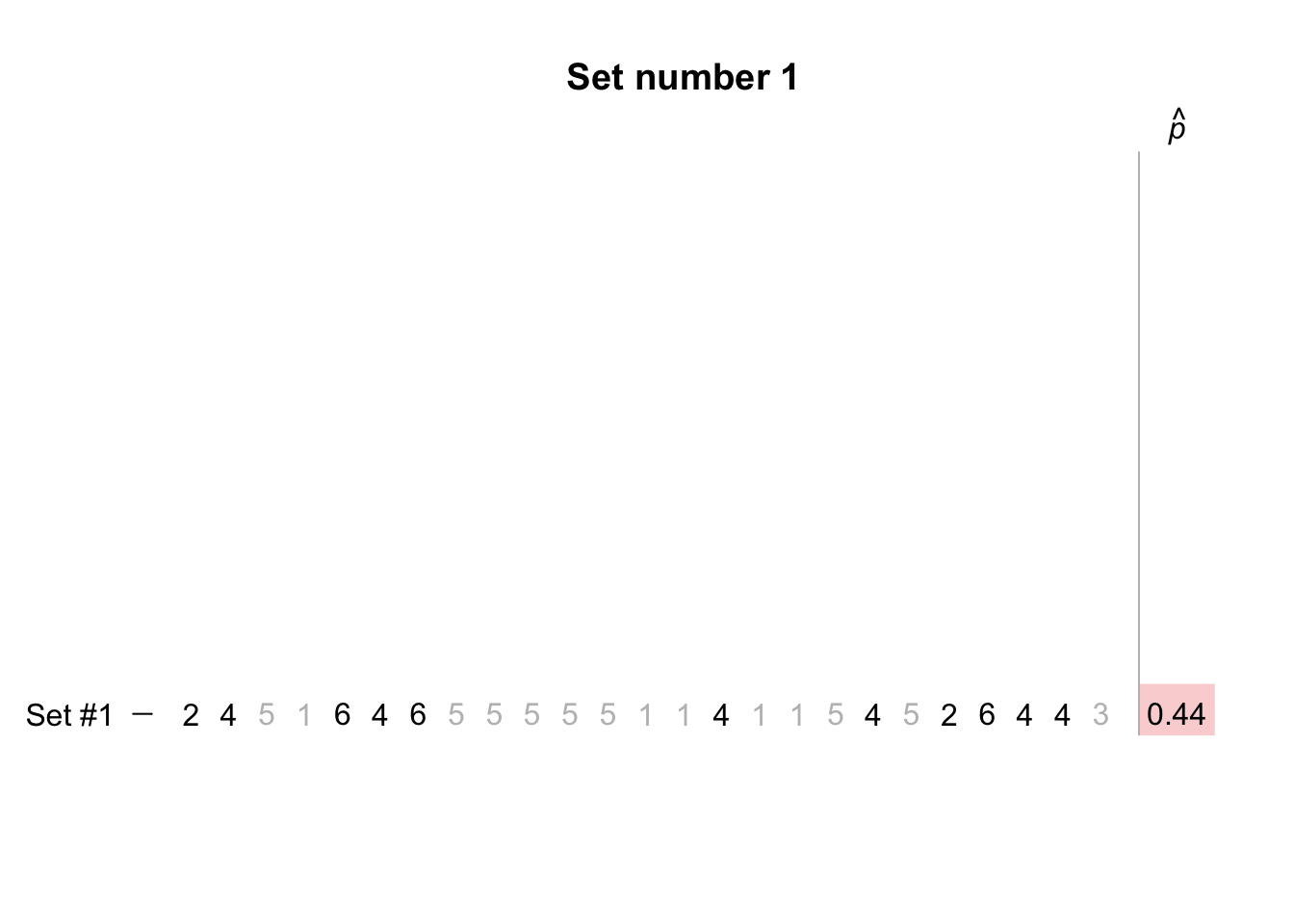 The proportion of rolls that is even varies from set to set. For these 10 sets of \(n=25\) rolls, the percentage of even rolls ranged from \(\hat{p}=0.32\) even rolls to \(\hat{p}=0.60\) even rolls.