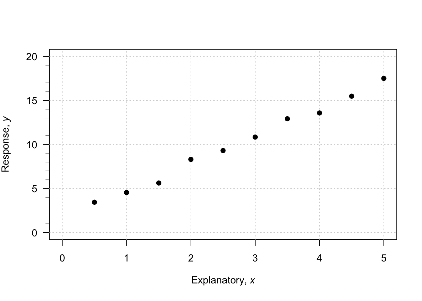 \[ \hat{y} = -4 + 2x. \] Here, \(x\) refers to the explanatory variable, \(y\) refers to the observed response variable, and \(\hat{y}\) refers to the predicted values of the response variable.