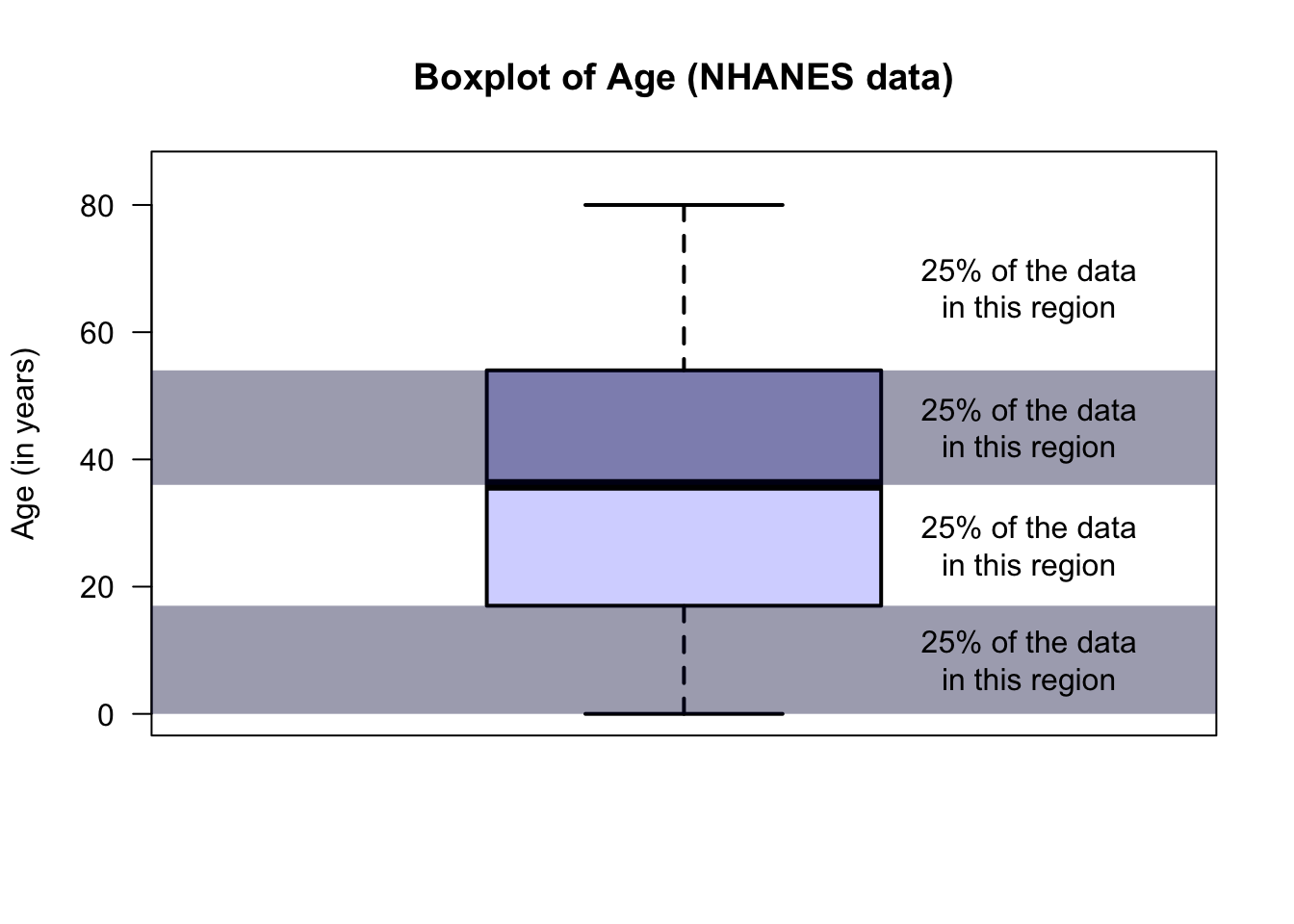 The animation below shows how the boxplot of the age of the Americans in the sample is constructed. The “average” age of the subjects is about 38 years, and the ages range from almost zero to about 80 years of age.
