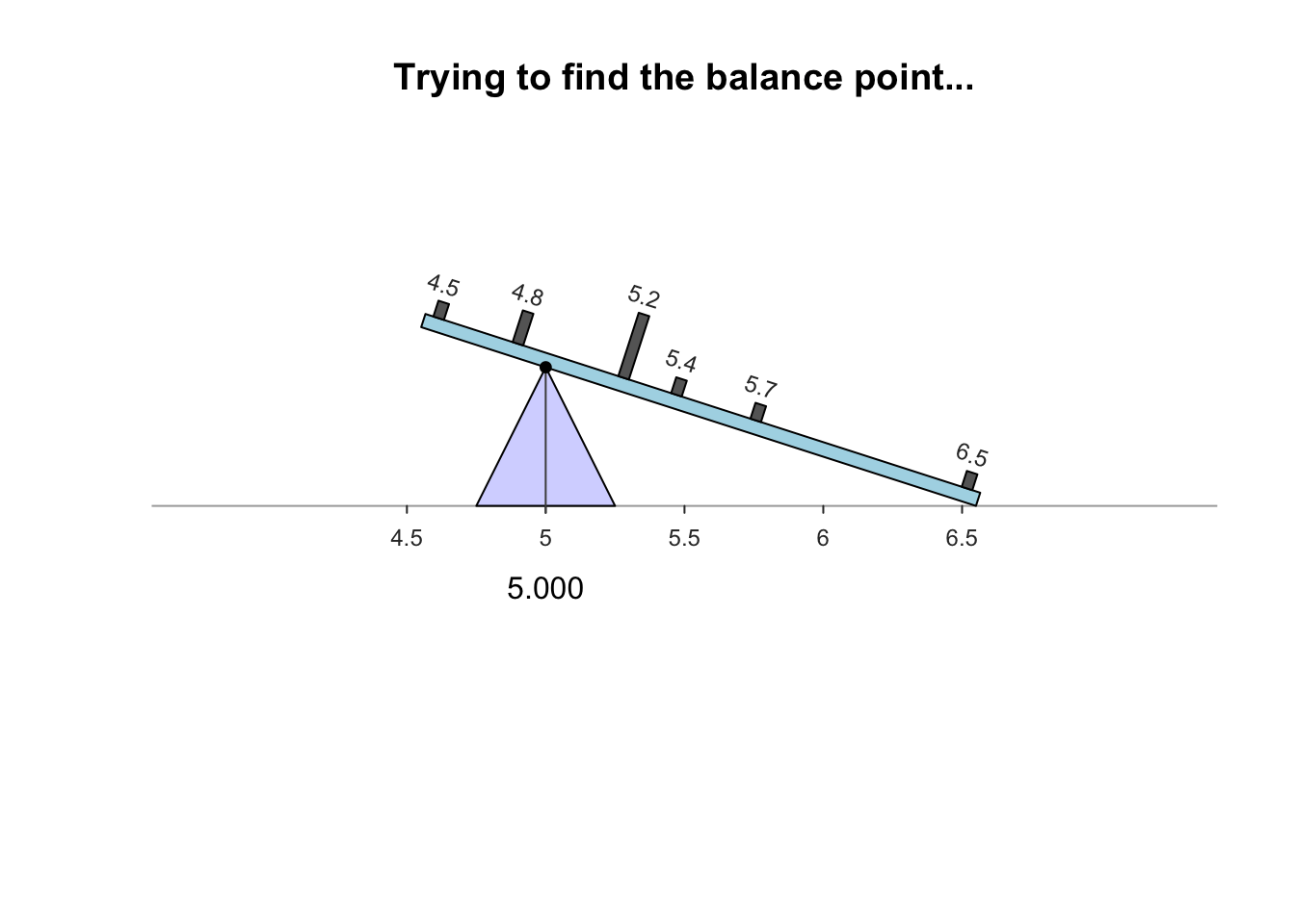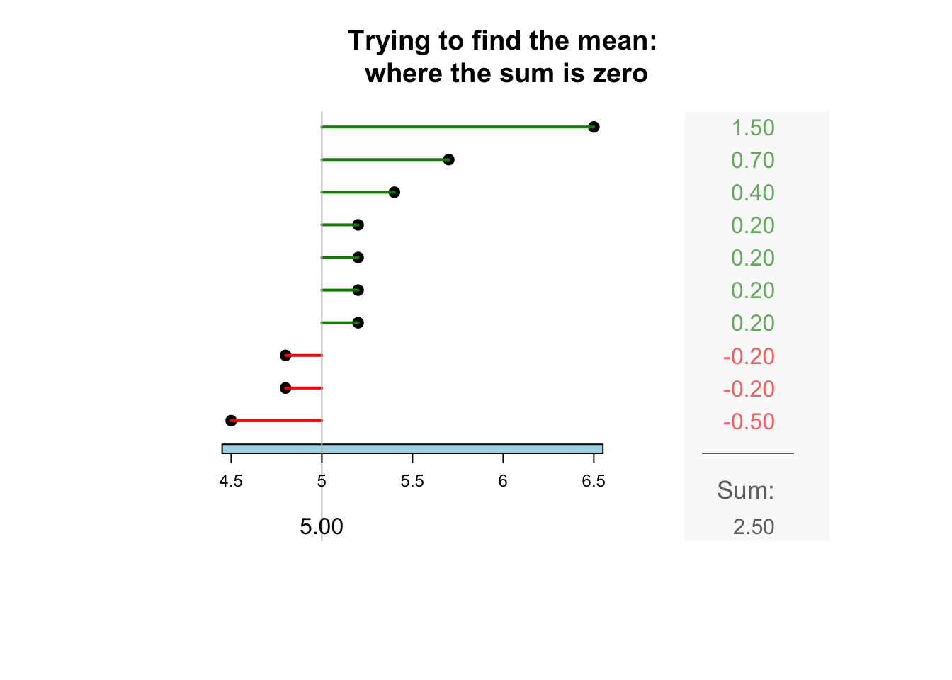 The sample mean is what people usually think of as the ‘average.’ The sample mean is actually the ‘balance point’ of the observations. The animation below shows how the mean acts as the balance point. Alternatively, the mean is the value such that the positive and negative distances of the observations from the mean add to zero , as shown in the animation below. Both of these explanations seem reasonable for identifying the ‘average’ of the data.