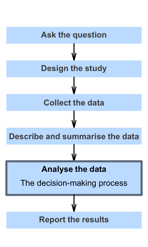 So far, you have learnt to ask a RQ, identify different ways of obtaining data, design the study, collect the data describe the data, and summarise data graphically and numerically.